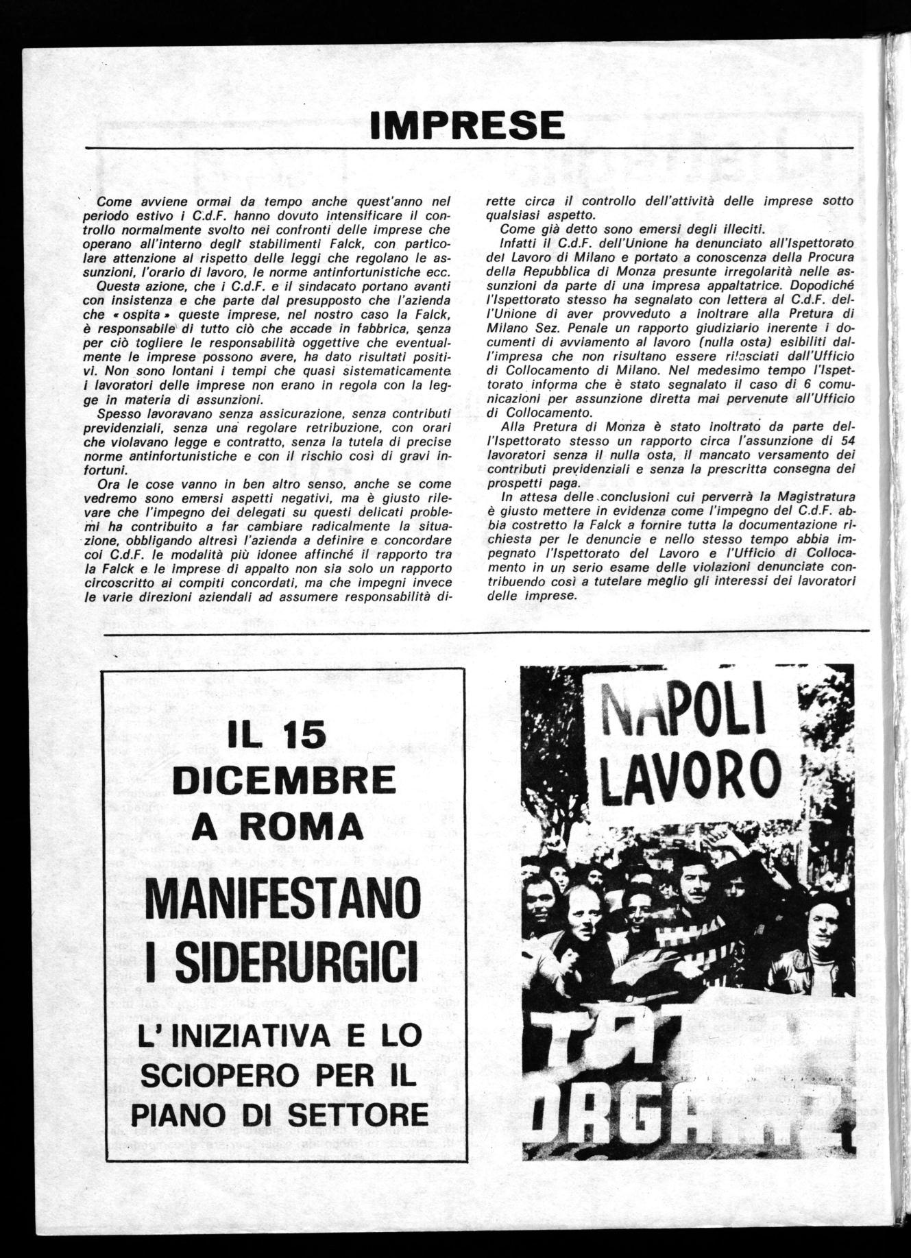 In attesa delle conclusioni cui perverrà la Magistratura è giusto mettere in evidenza come l'impegno del C.d.F. abbia costretto la Falck a fornire tutta la documentazione richiesta per le denuncie e nello stesso tempo abbia impegnato l'Ispettorato del Lavoro e l'Ufficio di Collocamento in un serio esame delle violazioni denunciate contribuendo così a tutelare meglio gli interessi dei lavoratori delle imprese.