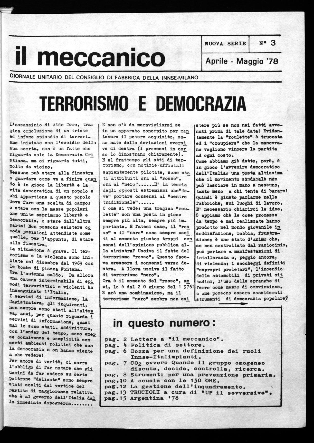 GIORNALE UNITARIO DEL CONSIGLIO DI FABBRICA DELLA INNSE-MILANOTERRORISMO E DEMOCRAZIA