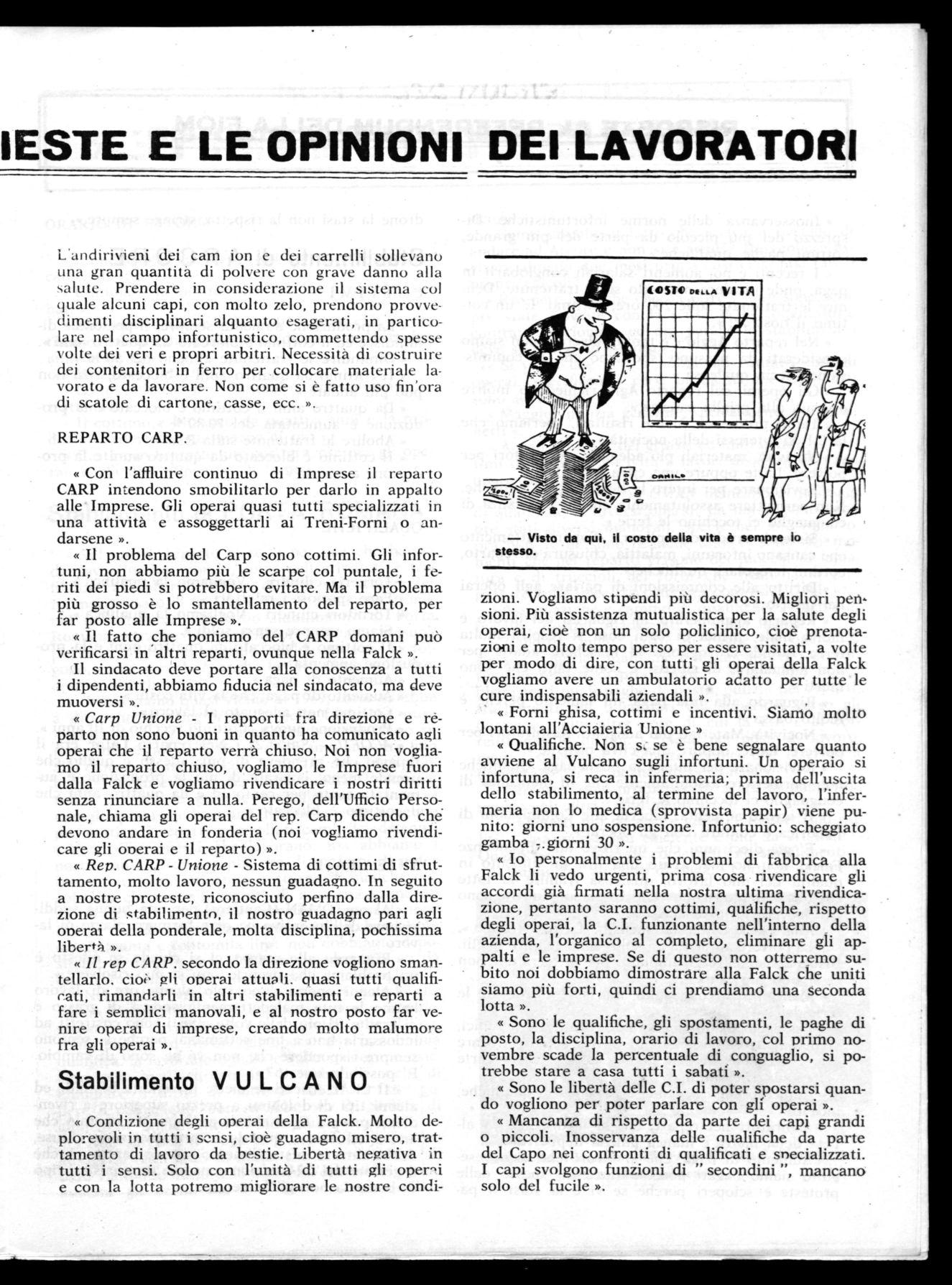 « Ormai siamo quasi vicino al 1969, come sarebbe a dire che la maggior parte delle fabbriche pure loro hanno i tre turni ed al sabato notte fanno riposo, invece noi della Falck dobbiamo lavorare fino alla domenica mattina così la nostra domenica dobbiamo dormire come degli imbambolati? Non sarebbe ora che le guardie sorvegliassero i ladri e non gli operai che lavorano, perchè sovente vengono per notti nei reparti controllati come dei detenuti e non come operai che lavorano; ma abbiamo i nostri capi? - Non sarebbe ora di parlarci di poter fare aumentare l'indennità notturna di qualche piccola lira che come indennità di notturna siamo un po' trascurati in base ai sacrifici che si fanno? Non è ora di smetterla di pagarci con banconote da cinquanta e centomila lire: non dobbiamo depositarle in banche, ma dobbiamo pagare chi ci dà da vivere e non tutti i negozi ce li cambiano! ».