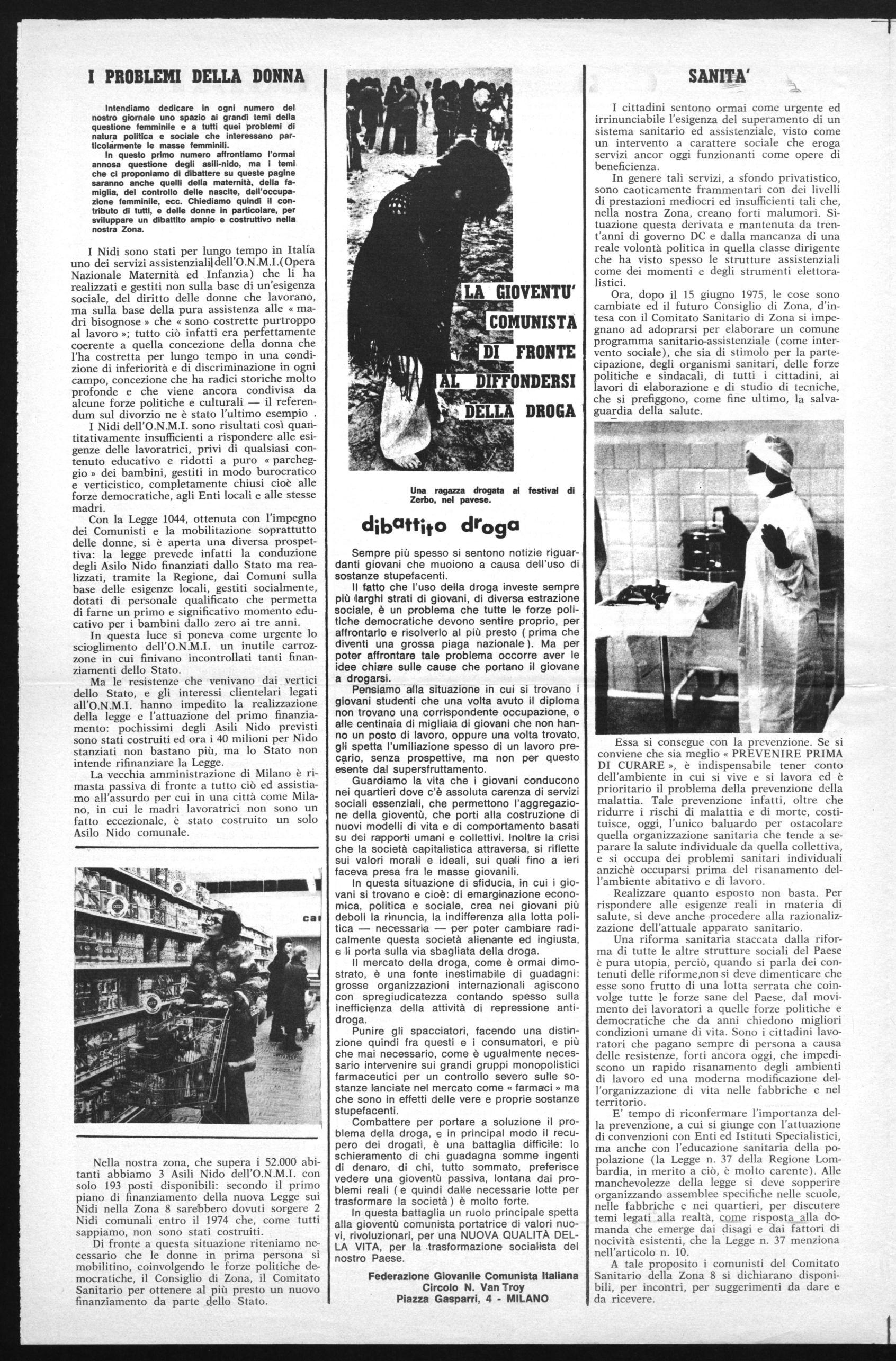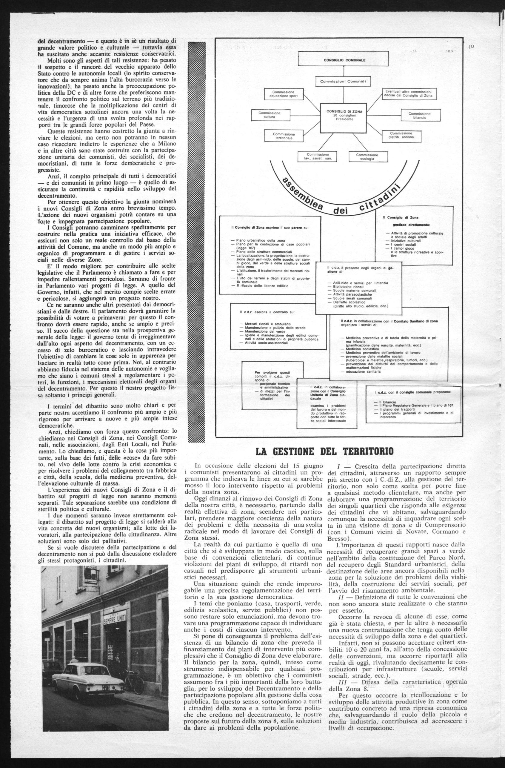 La battaglia per il rinnovo dei Consigli di Zona con le elezioni dirette dovrebbe essere la battaglia per l'effettiva partecipazione di tutte le forze democratiche popolari. In particolare a Milano la questione fondamentale deve diventare quella di attribuire poteri decisionali ai Consigli di Zona, una questione che malgrado l'errato metodo di costituzione dei Consigli dovrà vedere impegnati tutti gli organismi di massa (Comitati di Quartiere, C.U.Z., Consigli sanitari, ecc.) chiamati a rappresentare le forze democratiche nei nuovi Consigli.