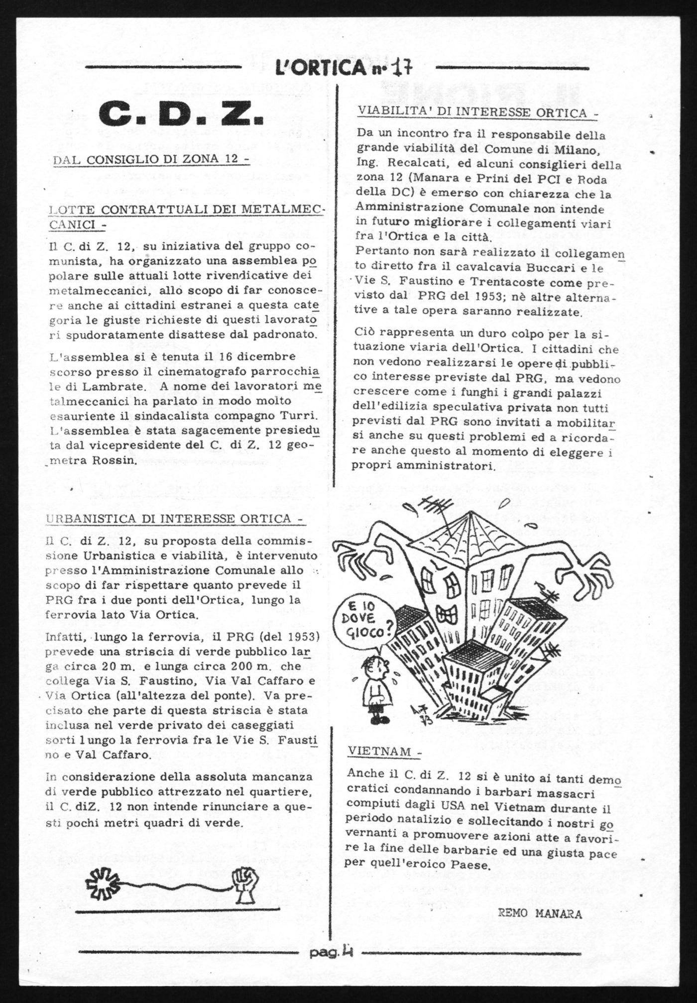 Da un incontro fra il responsabile della grande viabilità del Comune di Milano, Ing. Recalcati, ed alcuni consiglieri della zona 12 (Manara e Prini del PCI e Roda della DC) è emerso con chiarezza che la Amministrazione Comunale non intende in futuro migliorare i collegamenti viari fra l'Ortica e la città, Pertanto non sarà realizzato il collegamen to diretto fra il cavalcavia Buccari e le Vie S. Faustino e Trentacoste come previsto dal PRO del 1953; nè altre alternative a tale opera saranno realizzate, Ciò rappresenta un duro colpo per la situazione viaria dell'Ortica. I cittadini che non vedono realizzarsi le opere di pubblico interesse previste dal PRG, ma vedono crescere come i funghi i grandi palazzi dell'edilizia speculativa privata non tutti previsti dal PRG sono invitati a mobilitar si anche su questi problemi ed a ricorda reanche questo al momento di eleggere i propri amministratori.