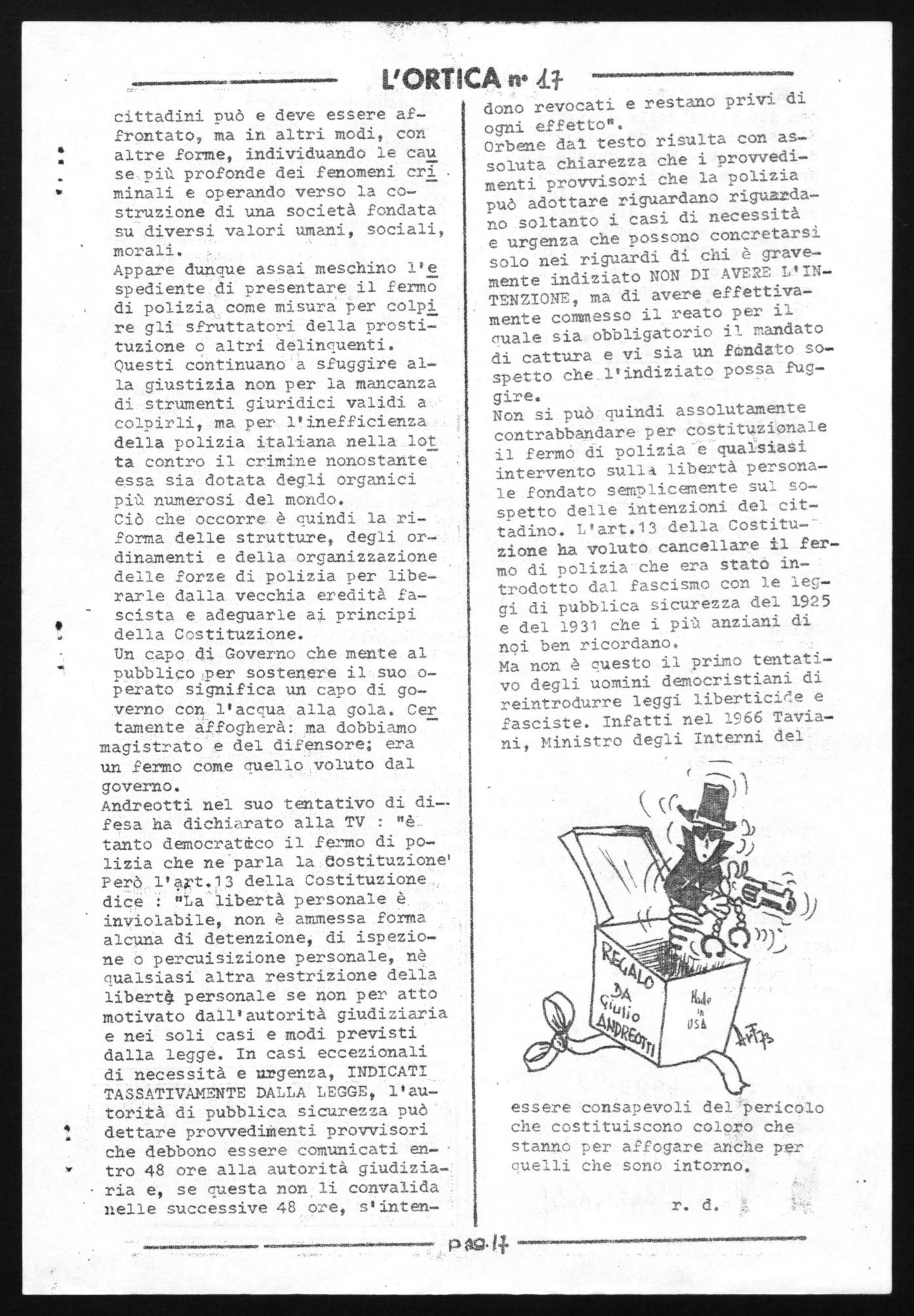 Andreotti nel suo tentativo di di-fesa ha dichiarato alla TV : "è tanto democratico il fermo di polizia che ne parla la Costituzione, Però l'apt.13 della Costituzione dice "La -libertà personale è inviolabile, non è ammessa forma. alcuna di detenzione, di ispezione o percuisizione personale, nè nualsiasi altra restrizione della libert4 personale se non per atto motivato dall'autorità giudiziaria e nei soli casi e modi previsti dalla legge. In casi eccezionali di necessità e urgenza, INDICATI TASSATIVAMENTE DALLA LEGGE, l'autorità di pubblica sicurezza può dettare provveditenti provvisori che debbono essere comunicati entro 48 ore alla autorità giudiziaria e, se questa non li convalida nelle successive 48 ore, s'inten-