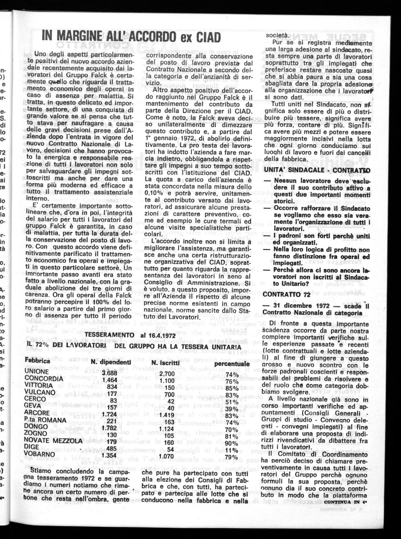 Altro aspetto positivo dell'accordo raggiunto nel Gruppo Falck è il mantenimento del contributo da parte della Direzione per il CIAD. Come è noto, la Falck aveva deciso unilateralmente di dimezzare questo contributo e, a partire dal 1'° gennaio 1972, di abolirlo definitivamente. La pro testa dei lavoratori ha indotto l'azienda a fare marcia indietro, obbligandola a rispettare gli impegni a suo tempo sottoscritti con l'istituzione del CIAD. La quota a carico dell'azienda è stata concordata nella misura dello 0,10% e potrà servire, unitamente al contributo versato dai lavoratori, ad assicurare alcune prestazioni di carattere preventivo, come ad esempio le cure termali ed alcune visite specialistiche particolari.