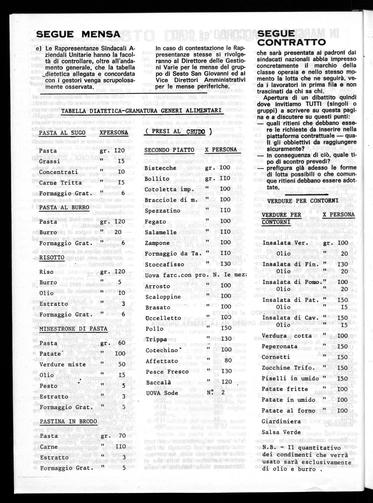 Funzionalità della Commissione Controllo mensa: rispetto delle grammature previste dalla tabella dietetica; - Controllo quantitativo e qualitativo dei pasti, controllo pulizie, costruzione refettori con cucine dove ancora non esistono, ecc. Distribuzione politica delle 69 mila ore acquisite fra i vari Consigli di Fabbrica e il Cooedinamento in modo da garanti re una funzionalità a tutte le nuove strutture di base che ci siamo dati.