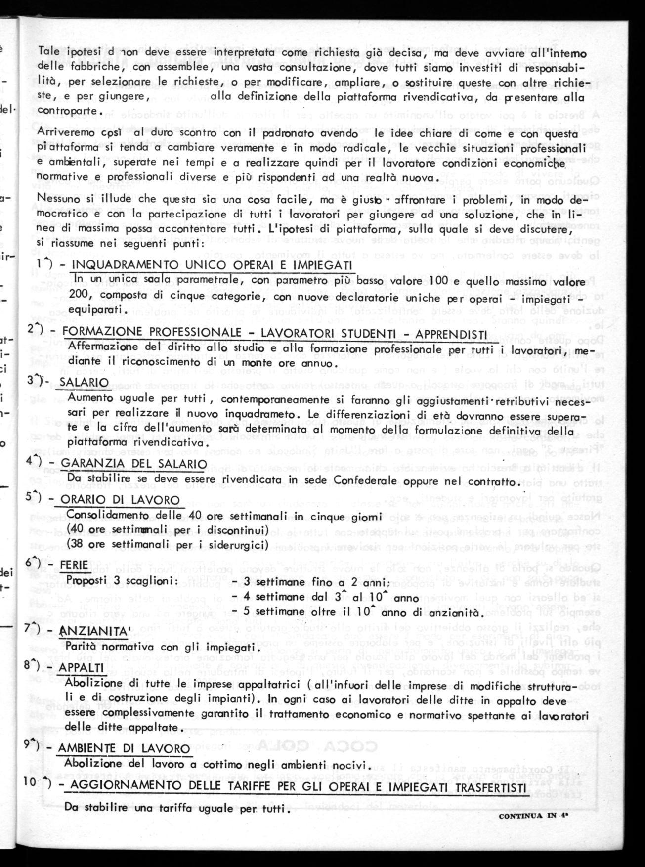 Arriveremo così al duro scontro con il padronato avendo le idee chiare di come e con questa pi attaforma si tenda a cambiare veramente e in modo radicale, le vecchie situazioni professionali e ambientali, superate nei tempi e a realizzare quindi per il lavoratore condizioni economiche normative e professionali diverse e più rispondenti ad una realtà nuova.