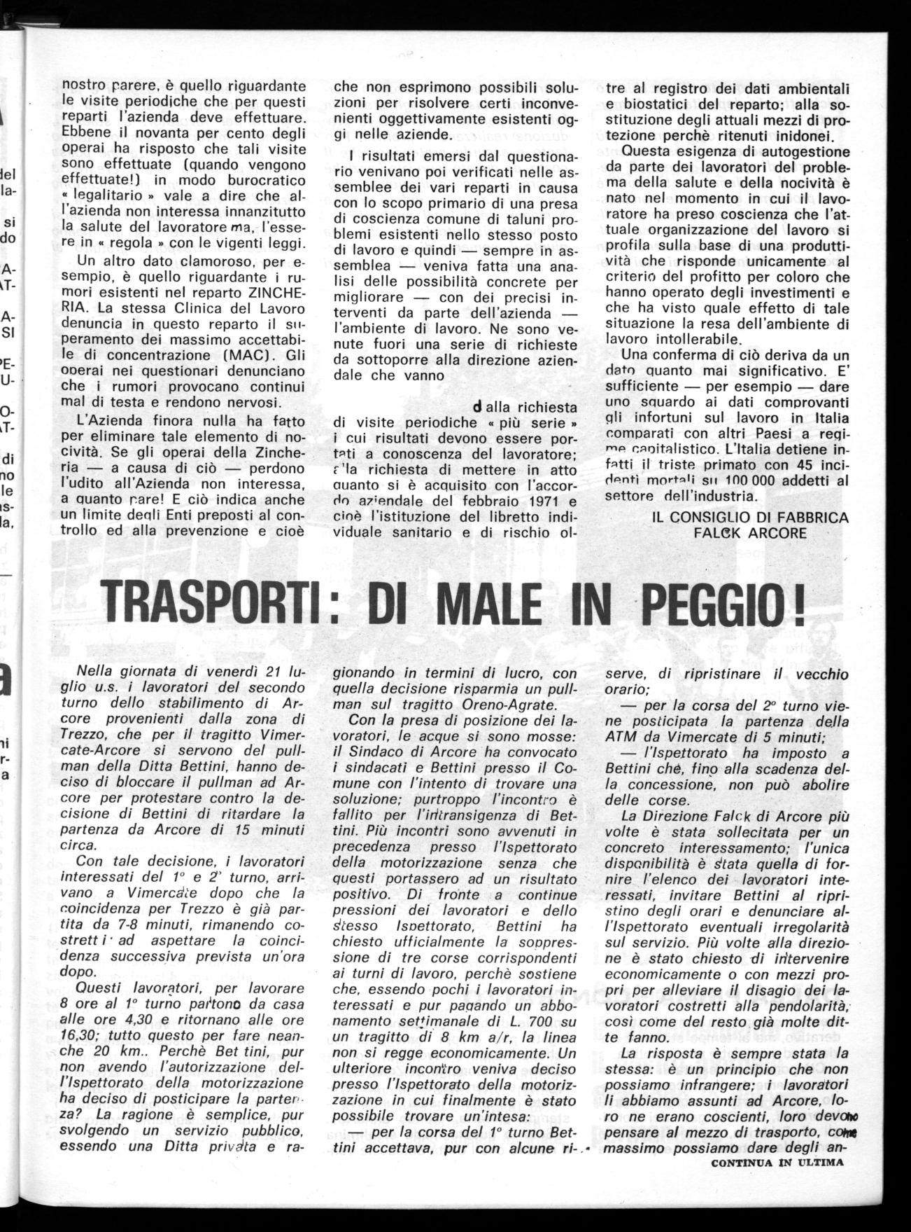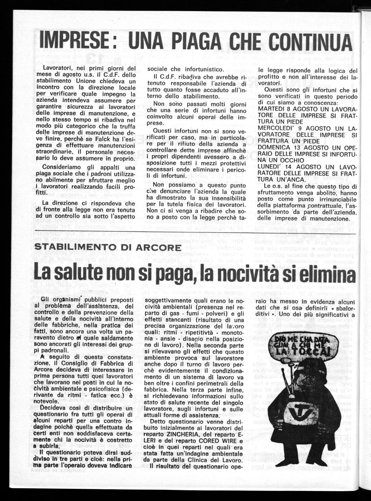 A seguito di questa constatazione, il Consiglio di Fabbrica di Arcore decideva di interessare in prima persona tutti quei lavoratori che lavorano nei posti ìn cui la nocività ambientale e psicofisica (derivante da ritmi - fatica ecc.) è notevole.