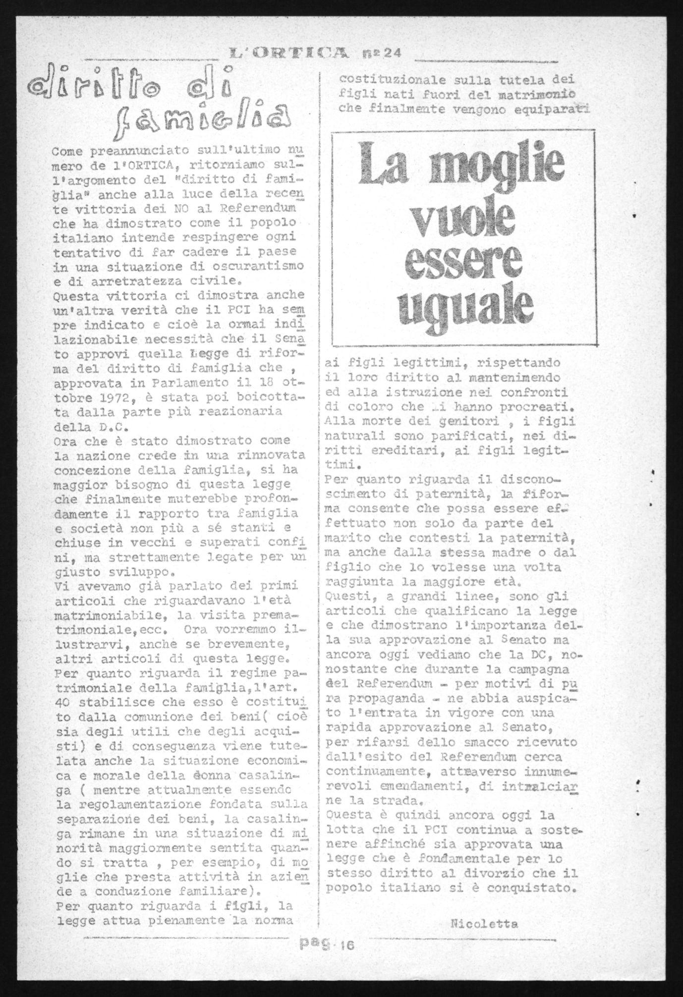 Come preannunciato sull'ultimo nu mero de l'ORTICA, ritorniamo sull'argomento del "diritto di famiglia" anche alla luce della recen te vittoria dei NO al Referendum che ha dimostrato come il popolo italiano intende respingere ogni tentativo di far cadere il paese in una situazione di oscurantismo e di arretratezza civile.