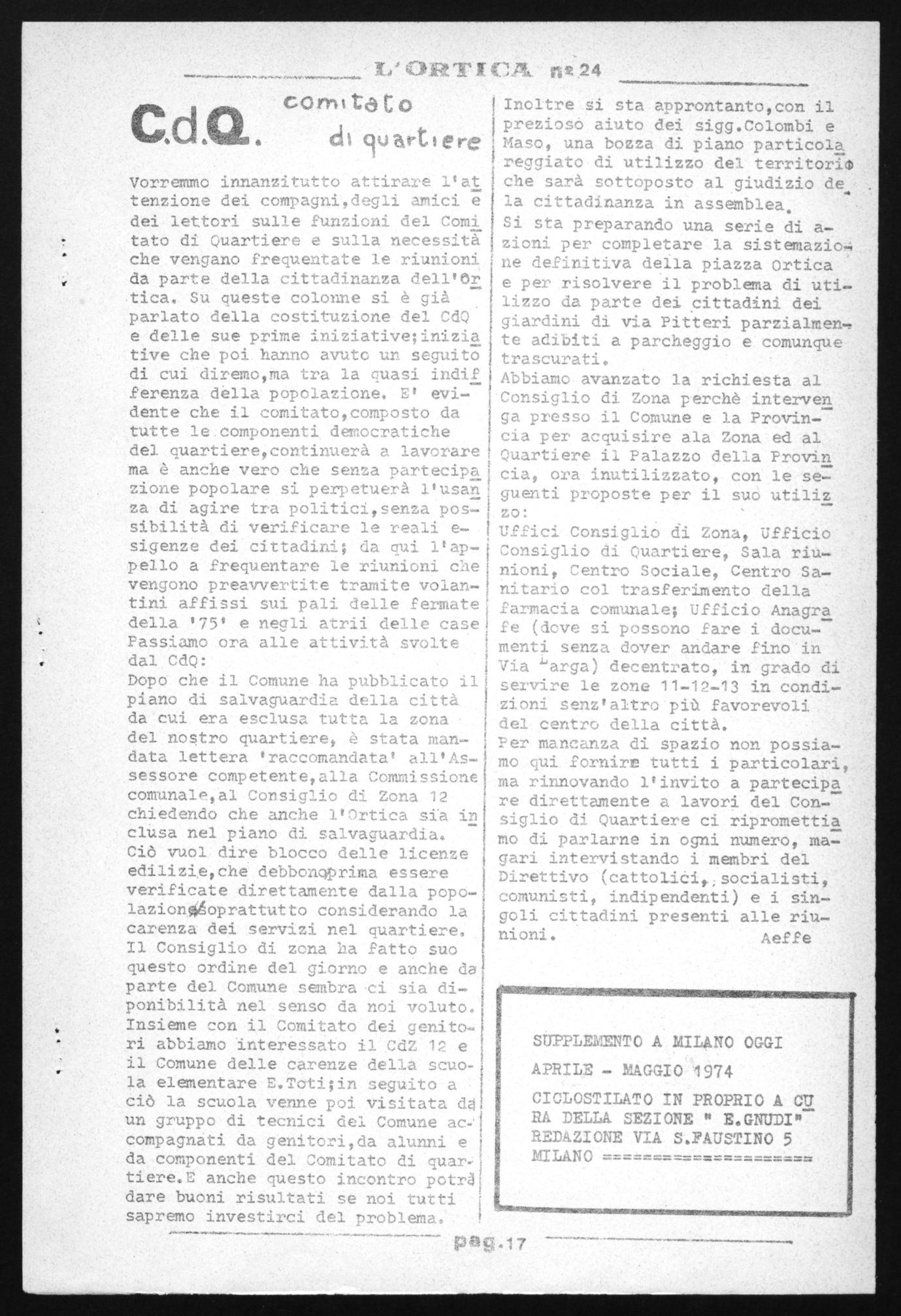 Ricordiamo inoltre che le richieste di cui sopra sono anche state presentate direttamente dai Consiglieri di Zona dell'Ortica alla Commissione Consiliare per l'Urbanistica nell'ambito dell'incontro con il Consiglio di Zona 12 avvenuto a Palazzo Marino il 17 maggio 1974.