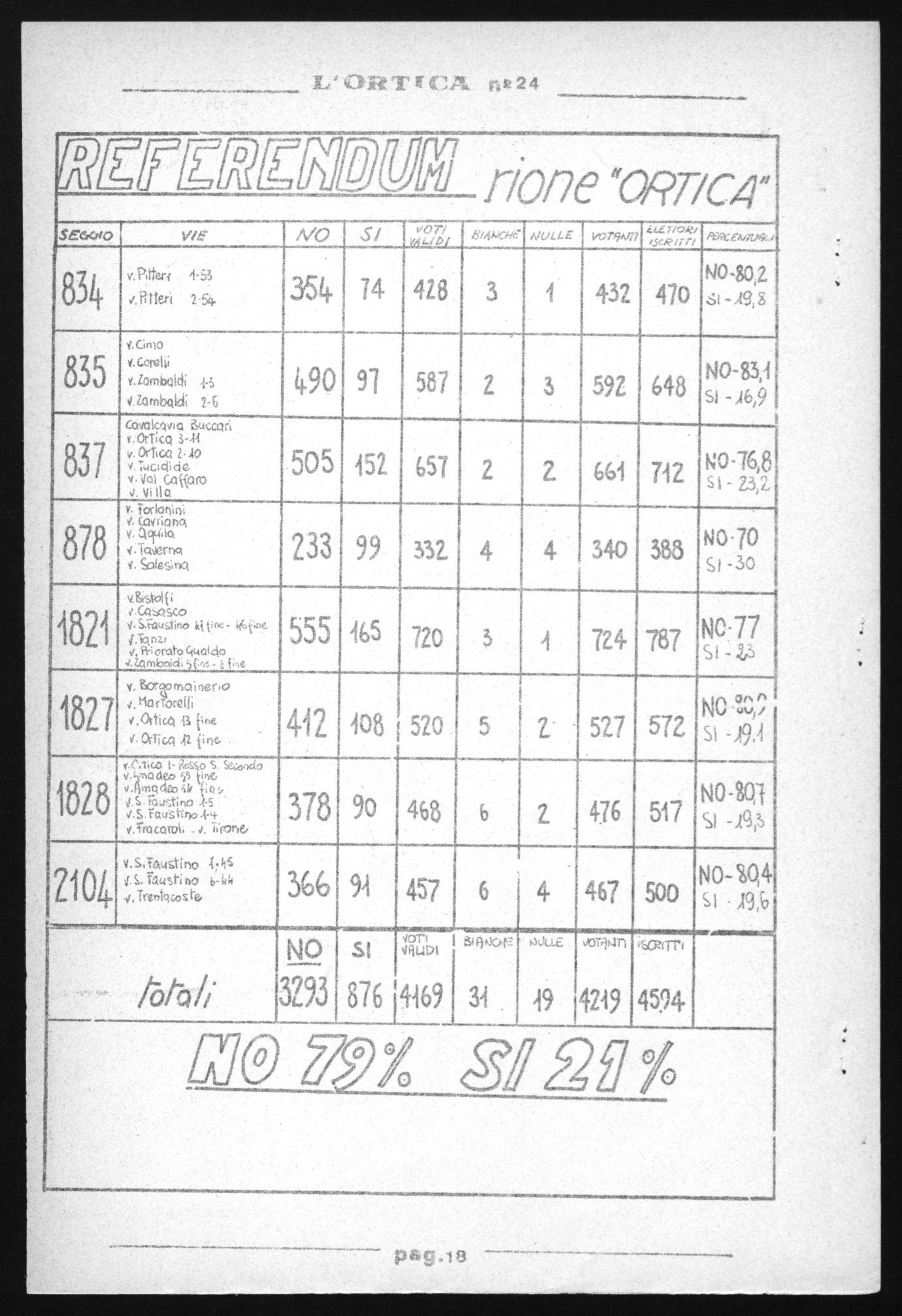 In primo luogo il risultatotche cc me sezione, sulla base dl interviste e sondaggi, davamo ampiamente scontato, nelle percentuali e nella seneibilità, infatti solo 50 su oltre 4.000 votanti hanno consegna to la scheda bianca o mal votata, inoltro ella votazione ha partecipato ben il 94 % della popolazione. Questo testimonia, se ancora ce ne fosse bisogno, che il rione è molto più sensibile alle sollecitaci° ni di libertà e di pregresso di quanto taluni intendono o vogliono far intendere. E una lezione delle quale occorre tener conto anche quando si va a discutere le soluezioni a livello locale; tenendo conto, in sostanza, delle indicazioni dl rinnoevamento contenute abbastanza chiaramente nel voto.