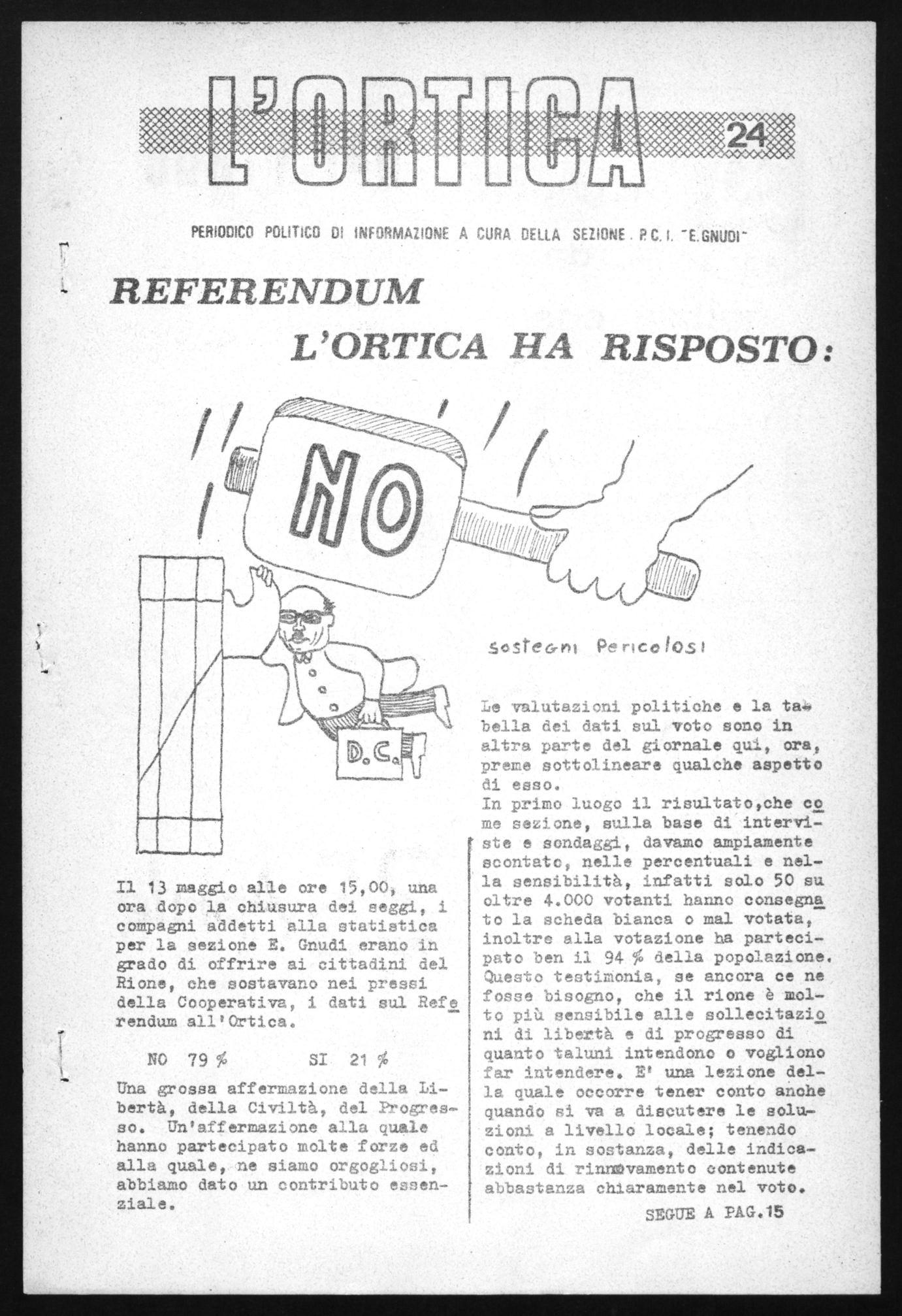 Il 13 maggio alle ore 15,00, una. ora dopo la chiusura dei seggi, i compagni addetti alla statistica per la sezione E. Gnudi erano in grado di offrire ai cittadini del Rione, che sostavano nel pressi della Cooperativa, i dati sul Refe rendum