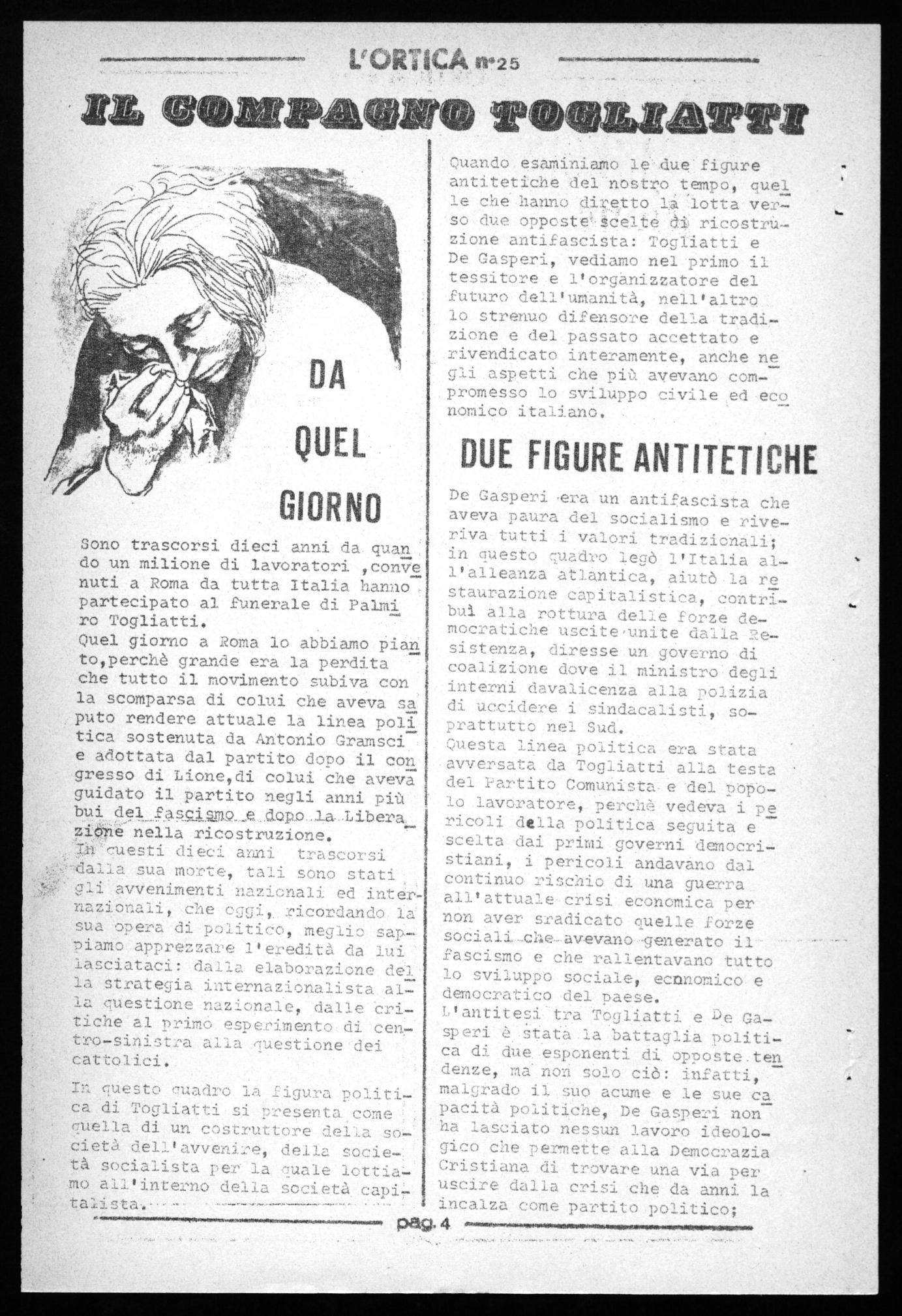 De Casperi Vera un antifascista che aveva paura del socialismo e riveriva tutti i valori tradizionali; Sono trascorsi dieci anni da quan . in questo euadro legò l'Italia aldo un milione dì lavoratori ,coeve l'alleanza atlantica, aiutò la re nuti a Roma da tutta Italia hanno staurazione capitalistica, contri- partecipato al funerale di Palmi buì alla rottura delle forze de- ro Togliatti. mocratiche uscite ,unite dalla ReQuel giorno a Roma lo abbiamo Pian sistenza, diresse un governo di to,perchè grande era la perdita coalizione dove il ministro degli che tutto il movimento subiva con t interni davalicenza alla polizia la scomparsa di colui che aveva sal di uccidere i sindacalisti, soputo rendere attuale la linea poli prattutto nel Sud. fica sostenuta da Antonio Gramsci questa linea politica era stata e adottata dal partito dopo il con avversata da Togliatti alla testa gresso di Lione,di colui che aveva del Partito Comunista. e del popbguidato il partito negli anni più lo lavoratore, Perché vedeva i pe bui 0-Cl.P.Pi.47119..egdopo_la-Libera ricoli della politica seguita e ziOie nella ricostruzione. scelta dai primi governi democri- ra uestí dieci anni trascorsi stiani, i pericoli andavano dal ‹dalla sua morte, tali sono stati continuo rischio di una guerra gli avvenimenti nazionali ed intérl all'attuale crisi economica per nazionali, che oggi,_ ricordando la non aver sradicato quelle forze sua opera di politico, meglio sap- socialiecìle-avevano-generato il - piamo apprezzare l'eredita da lui fascismo e che rallentavano tutto lasciataci: dalla elaborazione del lo sviluppo sociale, economico e la strategia internazionalista air democratico del paese. la questione nazionale, dalle cri- L'antitesi - tra Tógliatti e De Ga- tiche al prime, esperimento di ceni-speri è Stata la battaglia politi- tro-sinistra alla quettione dei cattolici. ca di due. esponenti di. opposte.ten dente, ma' non solo ciò: infatti, In questo cuadro la figura politi!- malgrado il suo acume e le sue ca ca di Togliatti si presenta come pacità politiche, De Gasperi non ha lasciato nessun lavoro ideolo euella di un costruttore della società dell'avvenire, della socie- gico che permette alla Democrazia tà socialista per' la quale lottia Cristiana di trovare una via per mo all'interno della società capi uscire dalla crisi che da anni la incalza come partito politico; peNI.4. 1.