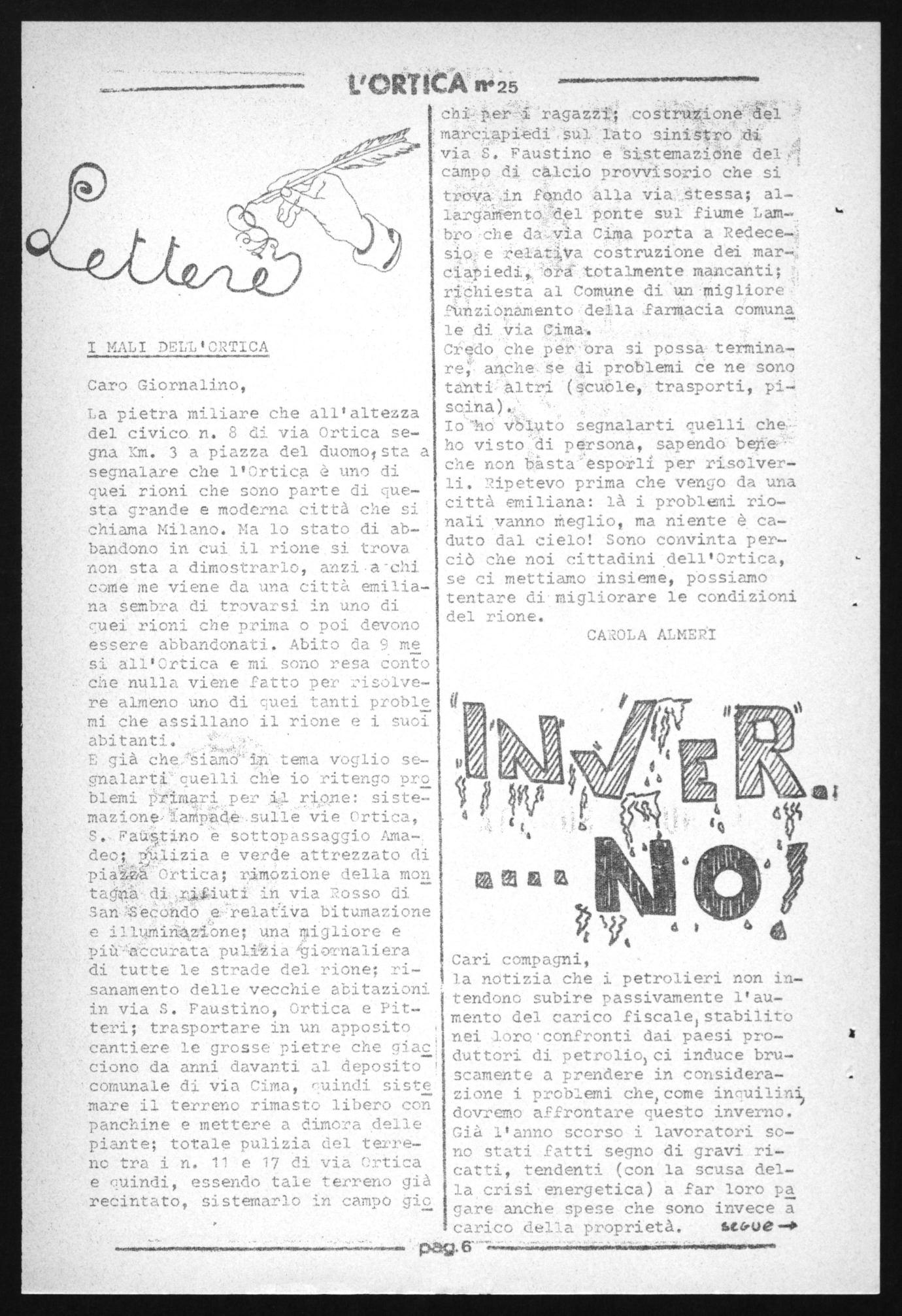 Caro Giornalino, La pietra miliare che all'altezza del civico. n. 8 di via Ortica segna I(m. 3 a piazza del duomo / sta e segnalare che l'Ortica è uno di quei rioni che sono parte di questa grande e moderna città che sj. chiama Milano. Ma lo stato di abbandono in cui il rione si trova non sta a dimostrarlo, anzi.a - chi come me viene da una città emiliana sembra di trovarsi in uno di euei rioni che prima o poi devono essere abbandonati. Abito da 9 me si all'Ortica e mi sono resa conto che nulla viene fatto per risolvere almeno uno di quei tanti proble mi che assillano il rione e i suoi abitanti. 'e .• 'e • E già cheSiamieri -tema voglio segnalartiequelli che io ritengo pro blemi Primari per il rione sistemazione»iaMesulle vie Ortica, S. Fatino e sottopassaggio Amadeo; lizia e verde attrezzato di piaUÙ'brtica; rimozione della mon tagq.dipiuti in via Rosso di 'ì SaneCOndóerelaelVa bitumazione l e illumir siAgtbne; una migliore e più-accurata puliíiaeioTnaliera di tutte le strade del rione; risanamento delle vecchie abitazioni in via S. Faustino, Ortica e Fitteri;• trasportare in un. apposito cantiere le grosse pietre che giac ciono da anni davanti ai deposito ! comunale di via Cima, euindi siste mare il terreno rimaste libero con panchine e mettere a dimora delle piante; totale pulizia dei terreno tra. i n. 11 e 17 di via Ortica e euindi, essendo tale terreno già recintato, sistemarlo in campo gio