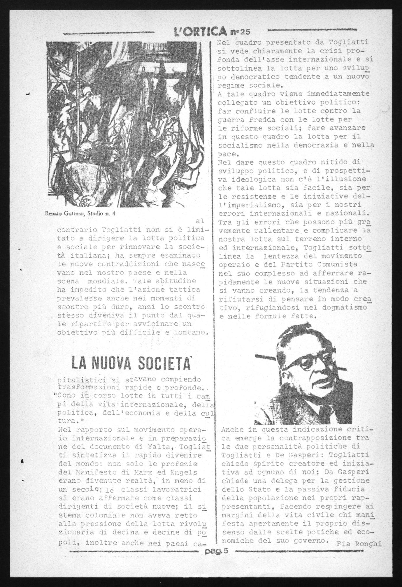 Anche in questa indicazione critienerge la contrapposizione tra le due personalità politiche di Togliatti e De Gasperi: Togliatti chiede spirito creatore ed. iniziativa ad ognuno di noi; Da Gasperi chiede una delega per la gestione dello Stato e la passiva fiducia della popolazione neí propri rappresentanti, facendo reTingere ai margini della vita civile chi mani eesta apertamente il proprio dissenso dalle scelte potiche ed economiche del suo governo. Pia Ronghi