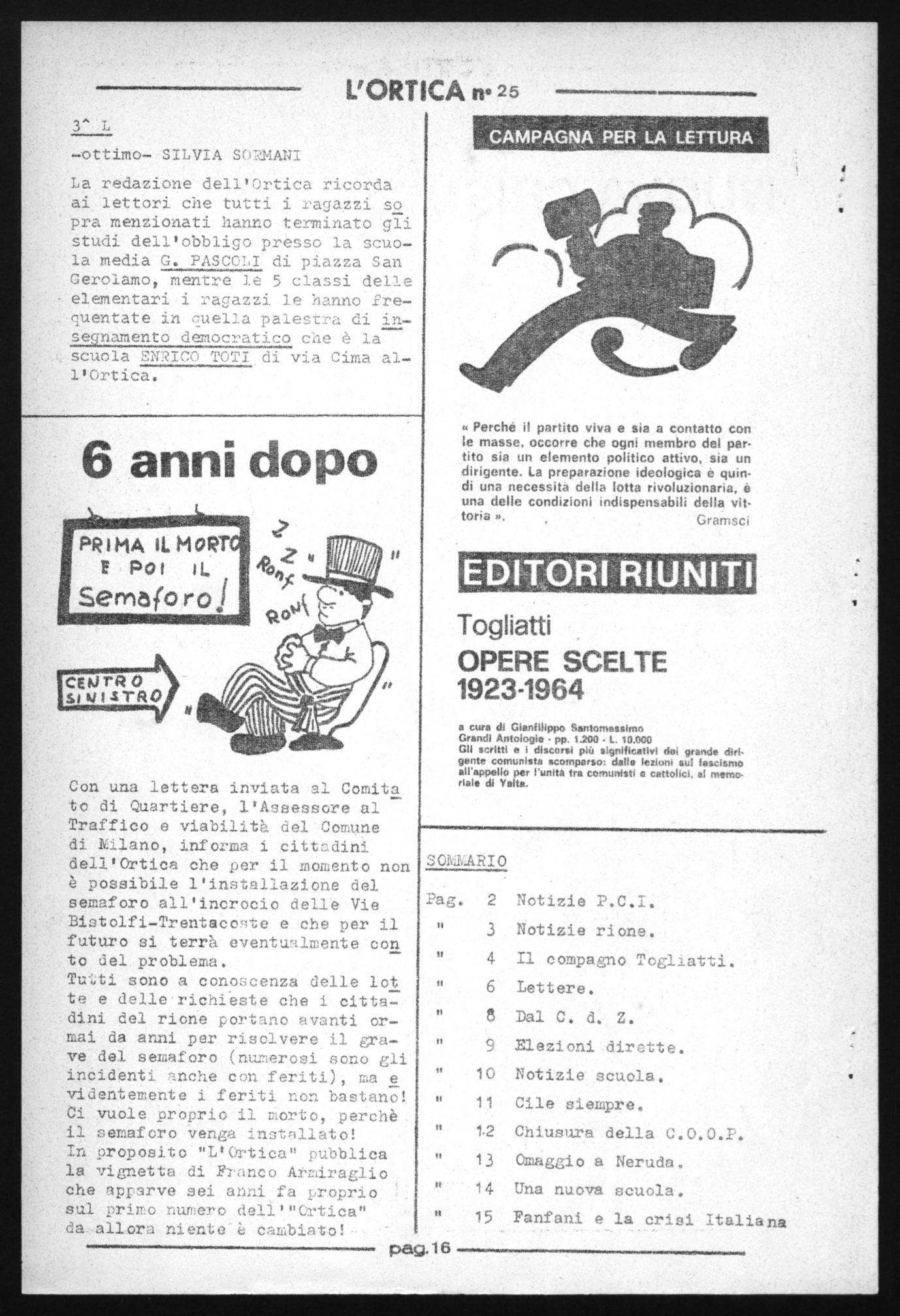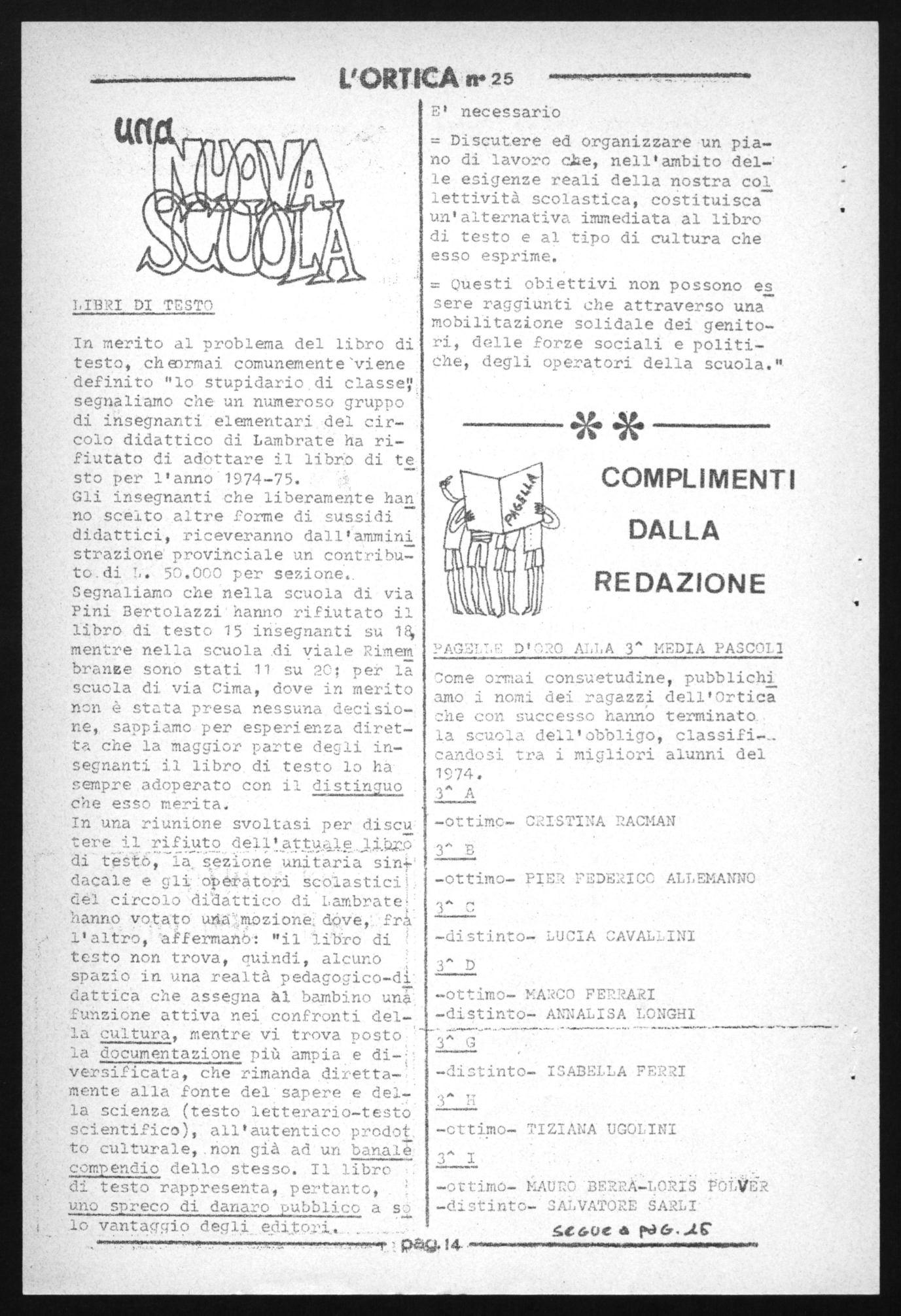 La redazione dell'Ortica ricorda ai lettori che tutti i ragazzi so pra menzionati hanno terminato gli studi dell'obbligo presso la scuola media G. PASCOLI di piazza San Gerolamo, mentre le 5 classi delle elementari i ragazzi le hanno EreTlentate in cuella palestra di inseernamento democratico che è la scuola snico TOTI di via Cima all'Ortica.