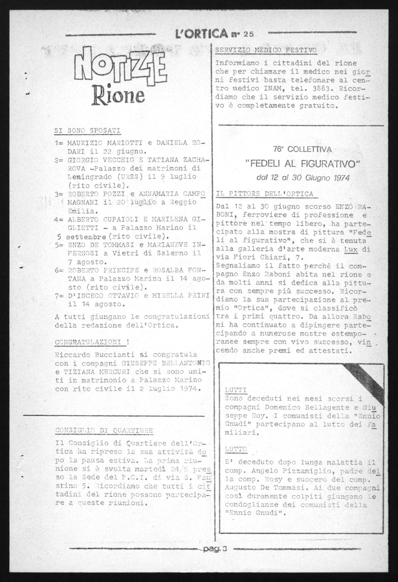 deceduto dopo lunga malattia comp. Angelo Pizzamiglio, padre del la comp. Rosy e suocero del comp. Augusto De Tommasi. .Ai due compauni Così duramente colpiti giungano Condoglianze dei comunisti della "Ennio Gnudi".