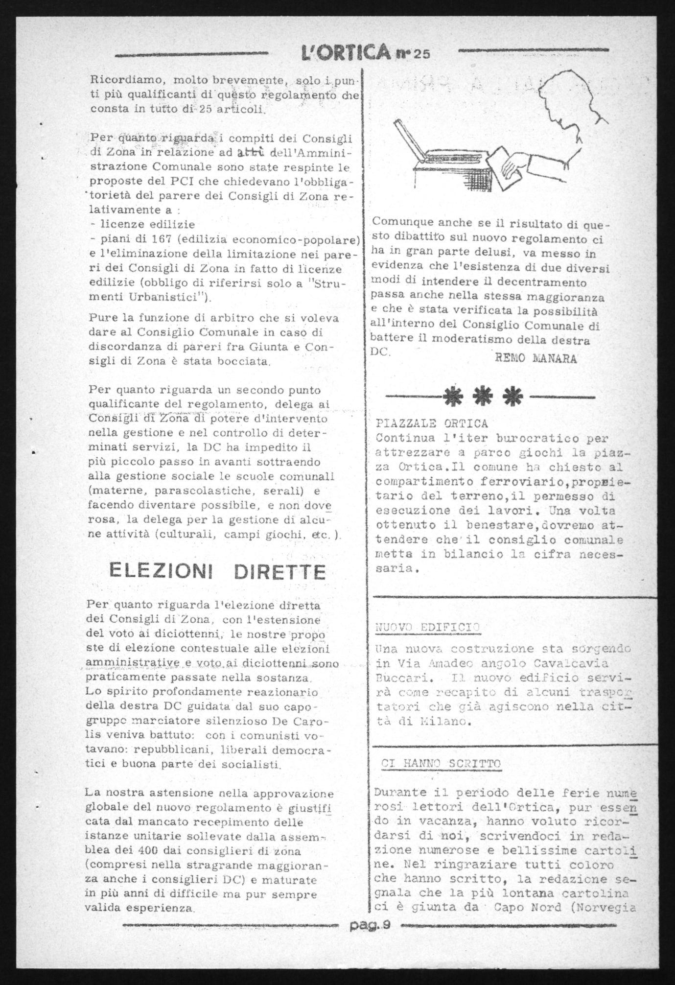 Comunque anche se il risultato dí questo dibattito sul nuovo regolamento ci ha in gran parte delusi, va messo in evidenza che l'esistenza di due diversi modi di intendere il decentramento passa anche nella stessa maggioranza e che è stata verificata la possibilità all'interno del Consiglio Comunale di battere il moderatismo della destra DC, REMO MANARA