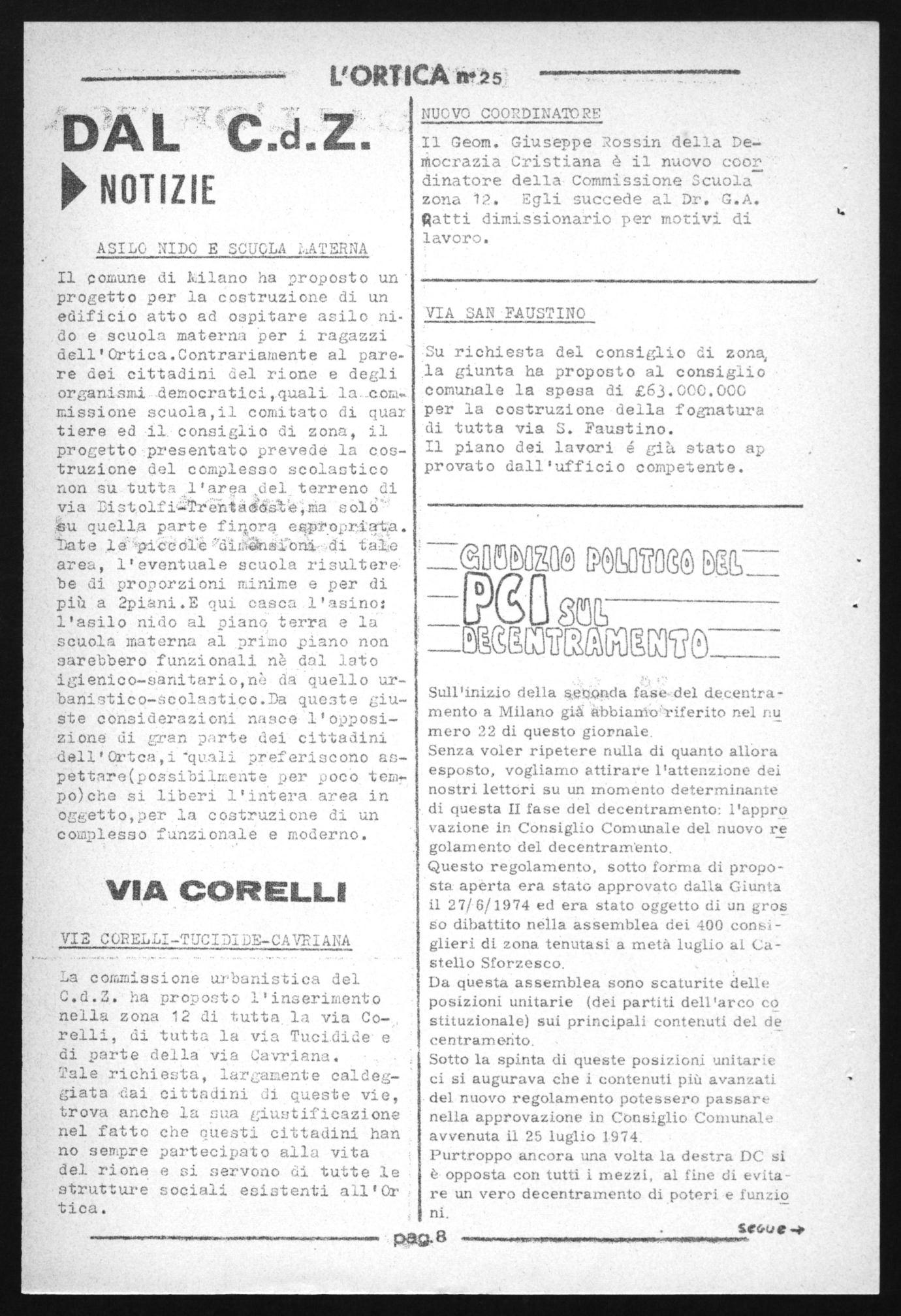 Il comune di kilano ha proposto un progetto per la costruzione di un edificio atto ad ospitare asilo nido e scuola materna per i ragazzi dell'Ortica.Oontrariamente al pare re dei cittadini del rione e degli organismi dee ocratici,quali missione scuola,i1 comitato di qua/ tiere ed il: consiglio di zona, il progettopresentato prevede la costruzione del complesso scolastico non su tuttaL'area del terreno di via Zist.olfiTte-illaddt;e:,.Ma colb”: u quella parte fillora espropriqta. tete laH,pitelédiZlhali'bni--di tale area, l'eventuale scuola risultere• be di proporzioni minime e per di più a 2piani.E qui casca l'asino: l'asilo nido al piano terra e la scuola materna al primo piano non sarebbero funzionali nè dal lato igienico-sanitario,n da 'quello urbanistico-colastico-Da queste giuste considerazioni nasce l'opposizione di gran parte dei cittadini aell'Ortca,i'quali preferiscono &tipett3re(po2sibilneAte per poco temlpo)che si liberi l'intera area in or.7getto,per la costruzione di un complesso funzionale e moderno.