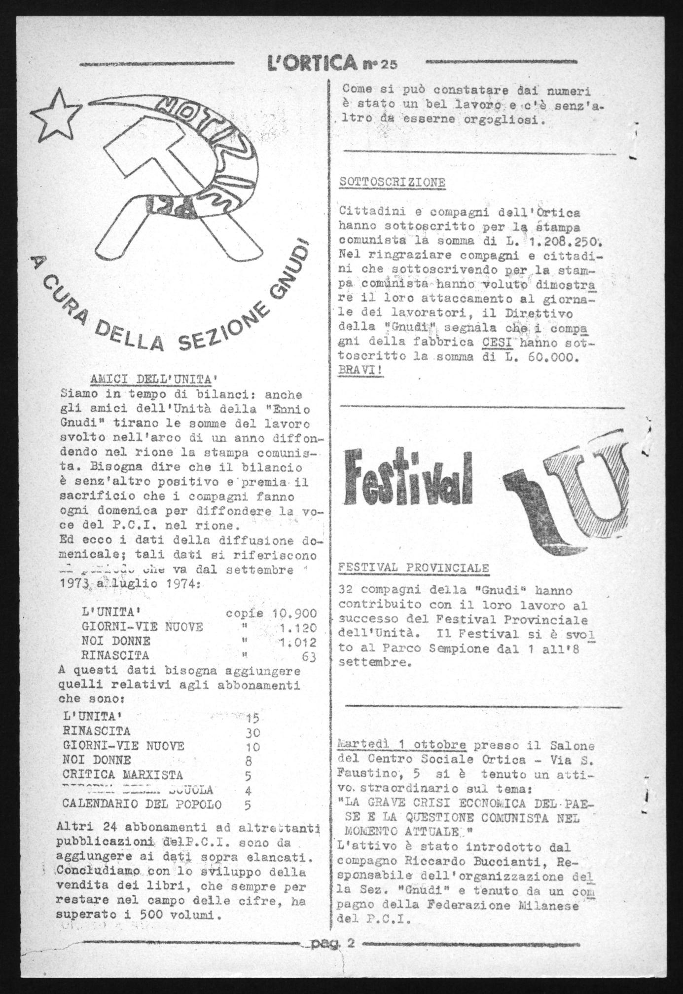Cittadini e compagni dell'Ortica hanno sottoscritto per la étampa comunista la somma di L. 1.208.2501. Nel ringraziare compagni e cittadini che sottoscrivendo per la stampa.comgiiéteitanno voluto dimostra re il loro attaccamento al giornale dei lavoratori, il Direttivo della ''Gnudi segnala che:i compa gni della fab'brica CEBI. hannosottoscritto la somma di L. 60.000.