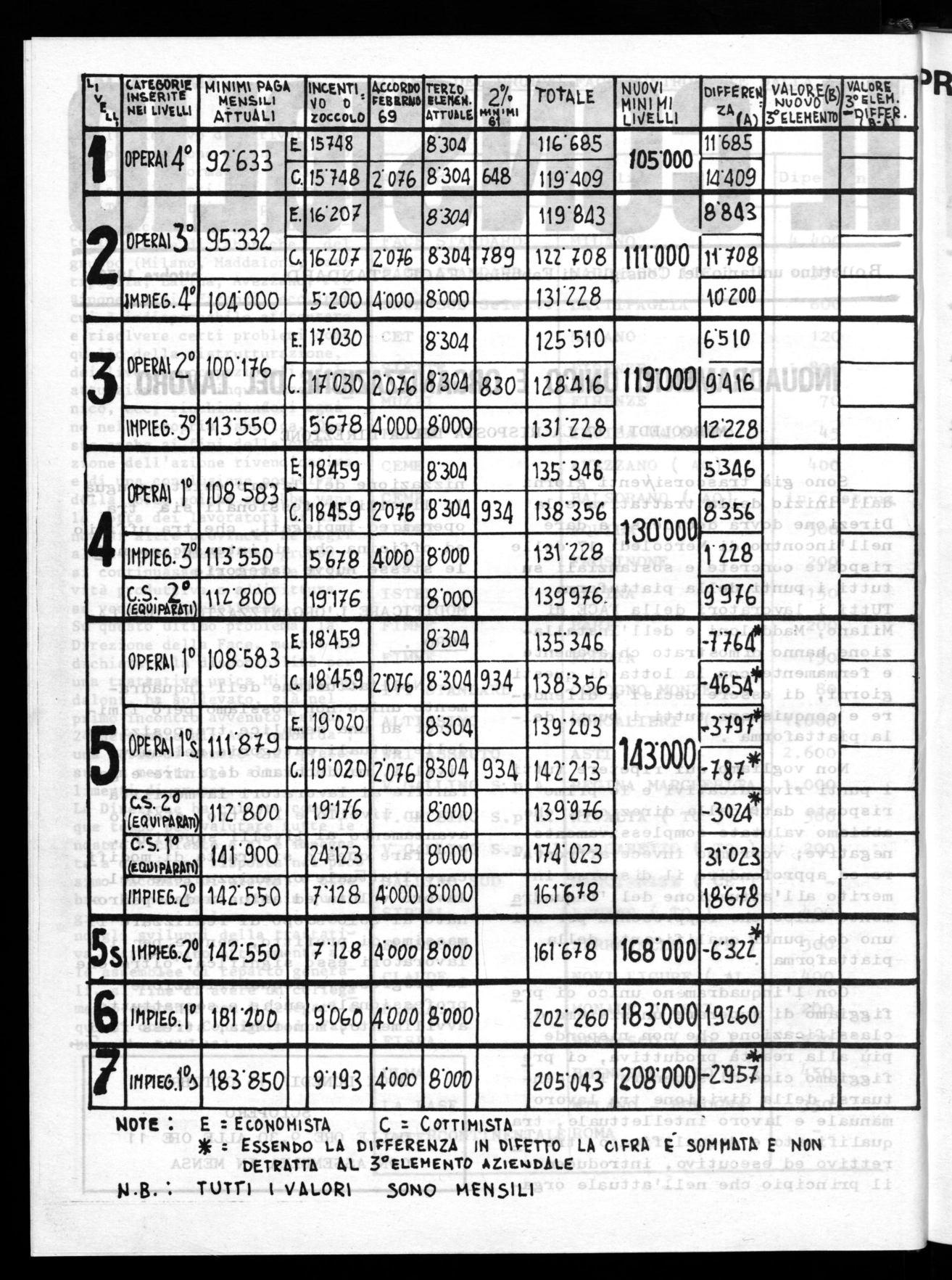 Sommando tutte queste voci, notiamo che il totale ( fatta eccezione per le cifre segnate con asterisco ) già supera i minimi salariali dei nuovi livelli, per cui resta un residuo indicato nella colonna ( A. )