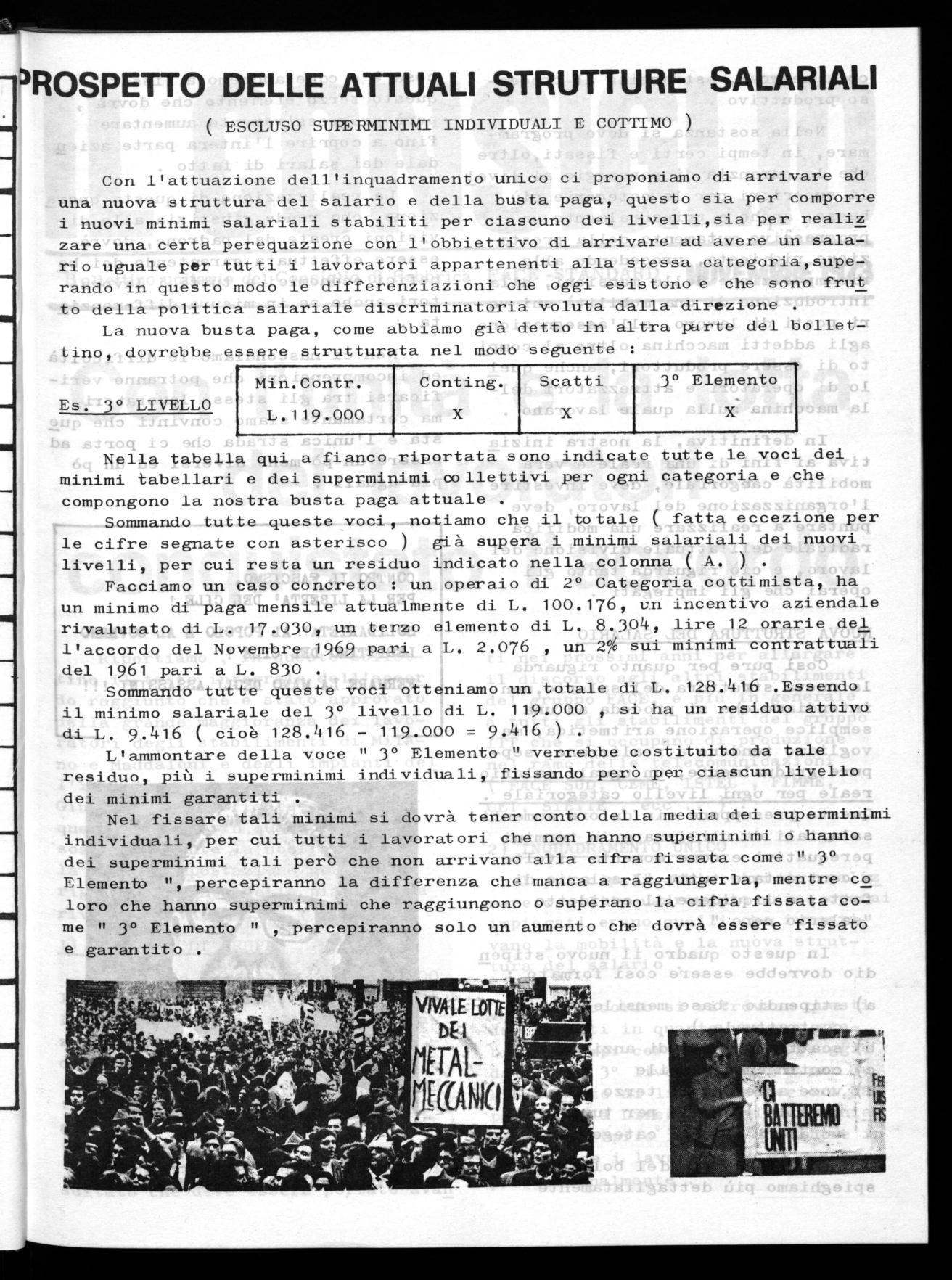 Con l'attuazione dell'inquadramento unico ci proponiamo di arrivare ad una nuova struttura del salario e della busta paga, questo sia per comporre i nuovi minimi salariali stabiliti per ciascuno dei livelli,sia per realiz zare una certa perequazione con l'obbiettivo di arrivare ad avere un salario uguale per tutti i lavoratori appartenenti alla stessa categoria,superando in questo modo le differenziazioni che oggi esistono e che sono frut to della politica salariale discriminatoria voluta dalla direzione .