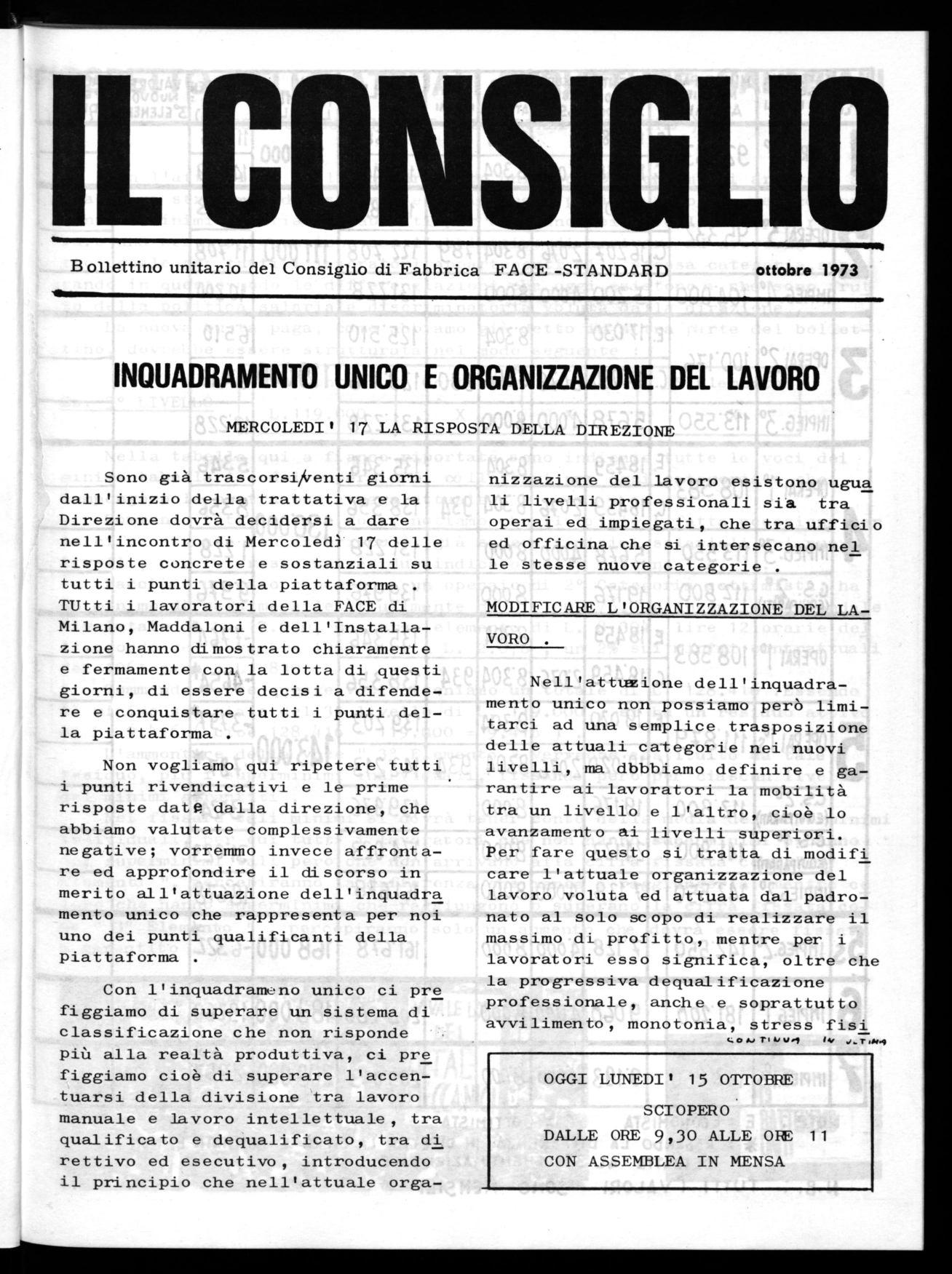 B ollettino unitario del Consiglio di Fabbrica FACE -STANDARD ottobre 1973