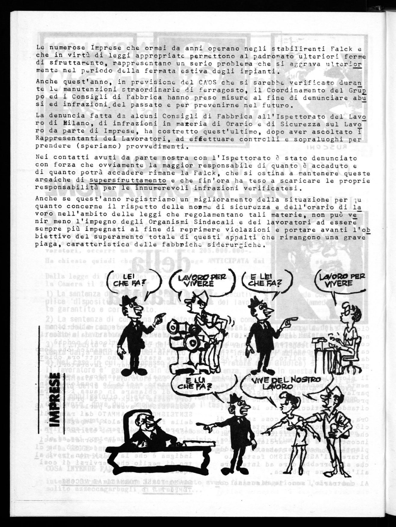 Le numerose Imprese che ormai da anni operano negli stabilimenti Falck e che in virtù di leggi appropriato permettono al padronato ulteriori forme di sfruttamento, rappresentano un serio problema che si aggrava ulterior mente nel periodo della fermata estiva degli impianti.
