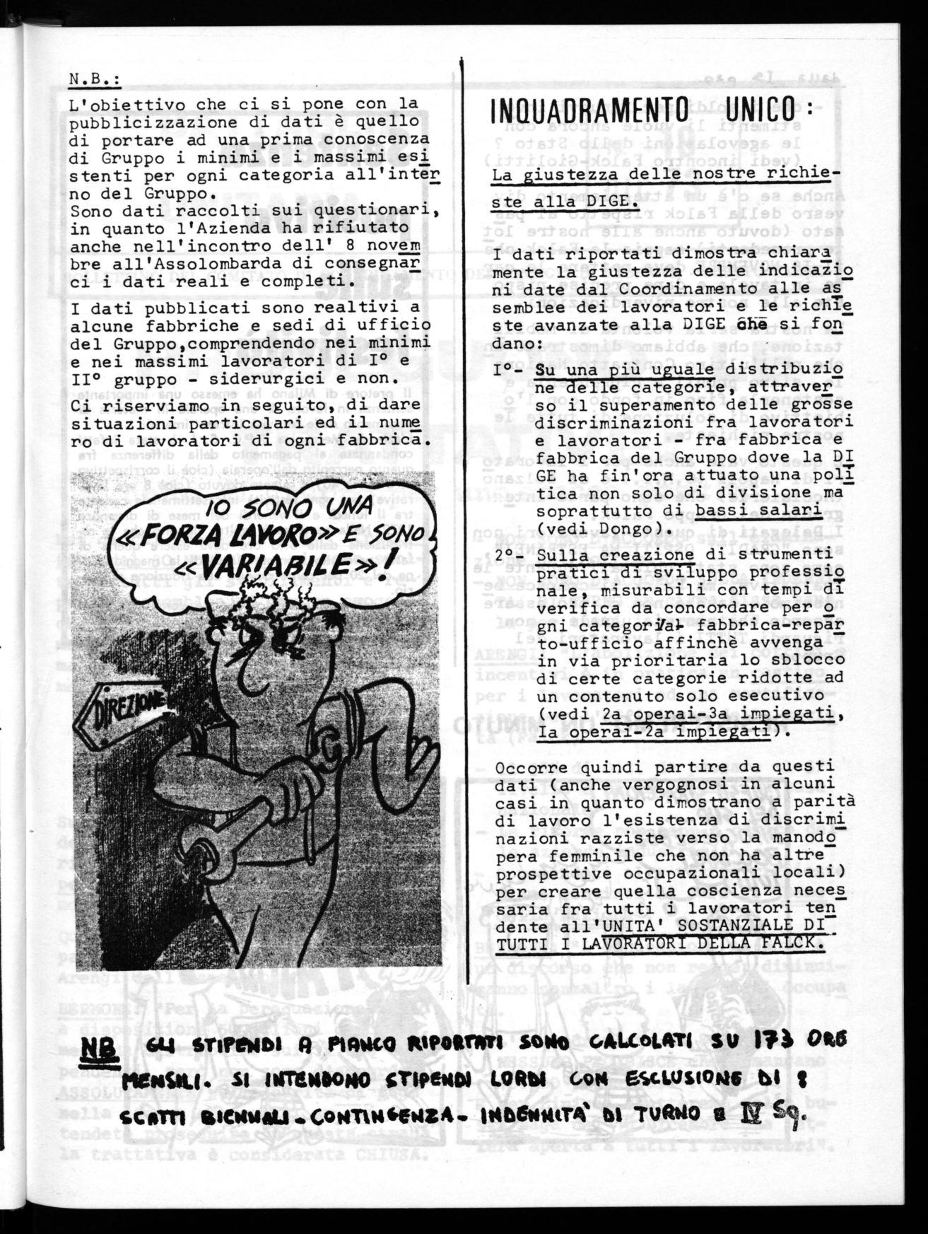 Occorre quindi partire da questi dati (anche vergognosi in alcuni casi in quanto dimostrano a parità di lavoro l'esistenza di discrimi nazioni razziste verso la manodo pera femminile che non ha altre prospettive occupazionali locali) per creare quella coscienza neces saria fra tutti i lavoratori ten dente all'UNITA' SOSTANZIALE DI TUTTI I LAVORATORI DALLA TALCK.