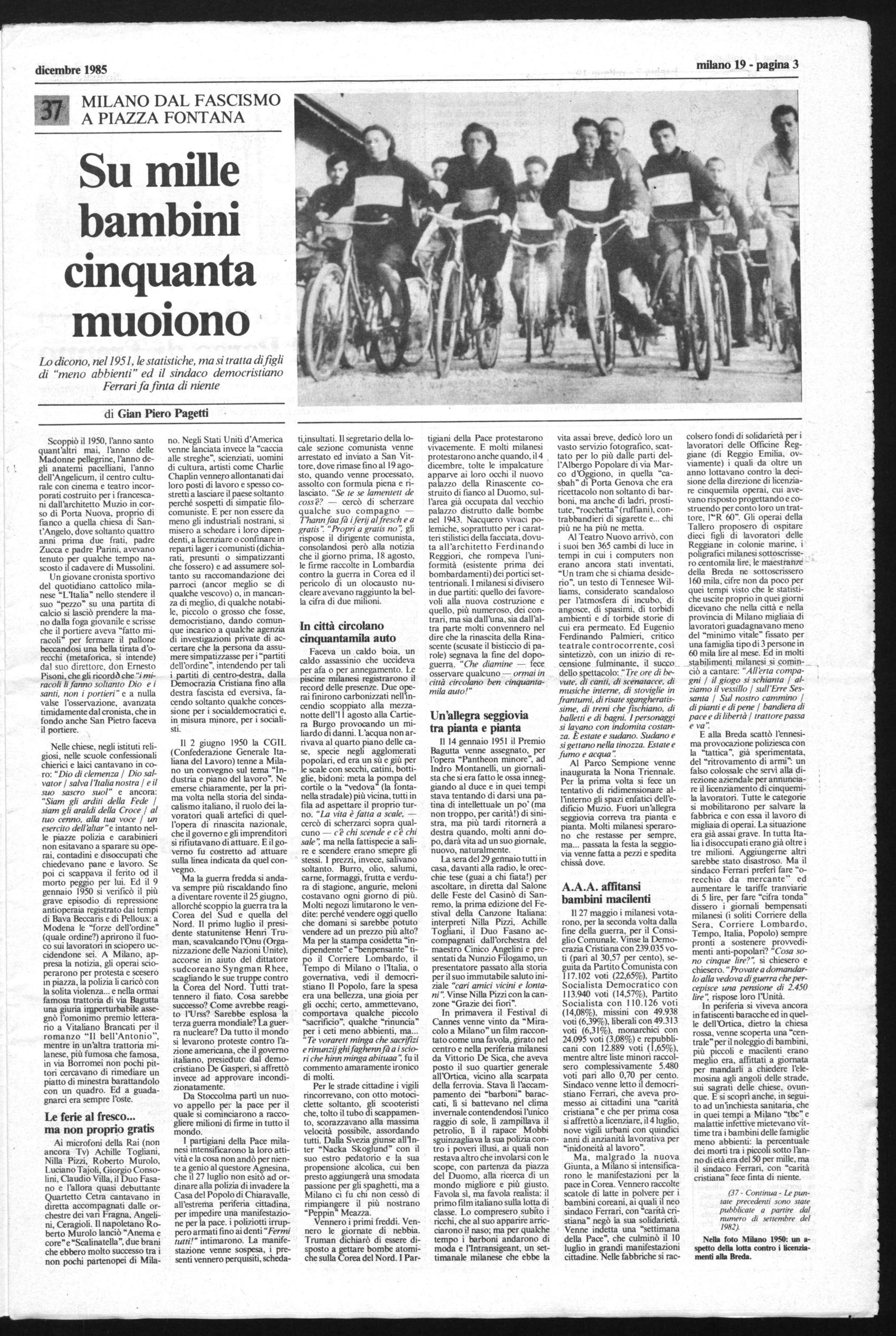 il tuo sguardo verrà a fissare, là, ove un'urna raccoglierà mie [spoglie, !Immagine materna, saprai, forse. apprezzarmi, e, in religioso silenzio [genuflesso, amare stille bagneran tuo ciglio. Allora, da tua genitrice muta ed inerte non sperar conforto. Di rose cosparso vorresti tuo [cammino per proseguir la via, mentre che orrende spine ostruiranno i tuoi passi. Come mendico, affranto di [dolore, tenderai ver' me le mani per impetrar perdono, ma le mie labbra, suggellate dalla morte, mai più le tue pene lenir [potranno. Buon natale e felice anno 1986 a tutti i lettori di Milano 19. Leonardo Clema