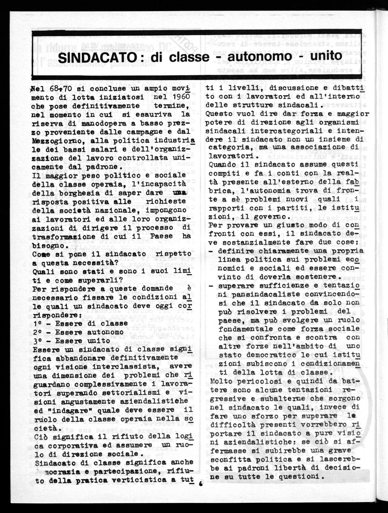vedono,prc:prio ne113 nostra pro— vincia,impegnate fabbriche e set— tori produttivi:come la BLOCH, MOTTA,ALEMAGNA,CREAS,con preva— lenza quasi ---;clusiva di manoùope ra femminile che vede in pericolo seimila posti di lavoro.Con questi dati,tutto il movimento deve fare i conti.In particolare nella fase acuta li crisi che stiamo attra— versndo,l'azione nostra nella fab— brica e nel paese non può prescin— dere dalle conseguenze che tale tendenza porta con