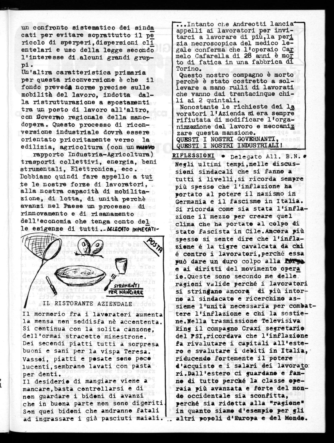 RIFLESSIONI • Delegato All. B.N.• Negli ultimi tempi,nelle discussioni sindacali che si fanno a tutti i livelli,si ricorda sempre più spesso che l'inflazione ha portato al potere il nazismo in Germania e il fascismo in Italia. Si ricorda come sia stata l'inflazione il mezzo per creare quel clima che ha portato al colpo di stato fascista in Cile.Ahcora più spesso si sente dire che l'inflazione é la tigre cavalcata da chi é contro i lavoratorilperche essa può dare un duro colpo alla Iffire» e ai diritti del movimento opera io.Queste sono secondo me delle ragioni valide perché i lavoratori si strinano ancora di più intorno al sindacate e ricerchino assieme l'unità necessaria per combattere l'inflazione e chi la sr, stiene.Nella trasmissione Televisiva Ring il compagno Craxi segretarie del PSI,ricordava che l'inflazione fa rivalutare i capitali all'estero e svalutare i debiti in Italia, riducendo fortemente il potere d'acquisto e i salari dei lavorato: ri.Dall'estero ci guardane e fanne di tutto perché la classe operaia più avanzata e forte del mondo occidentale sia sconfitta, perché sia ridetta alla "ragione" in quanto siamo d'esempio per gli altri popoli d'Europa e del )(Onde.