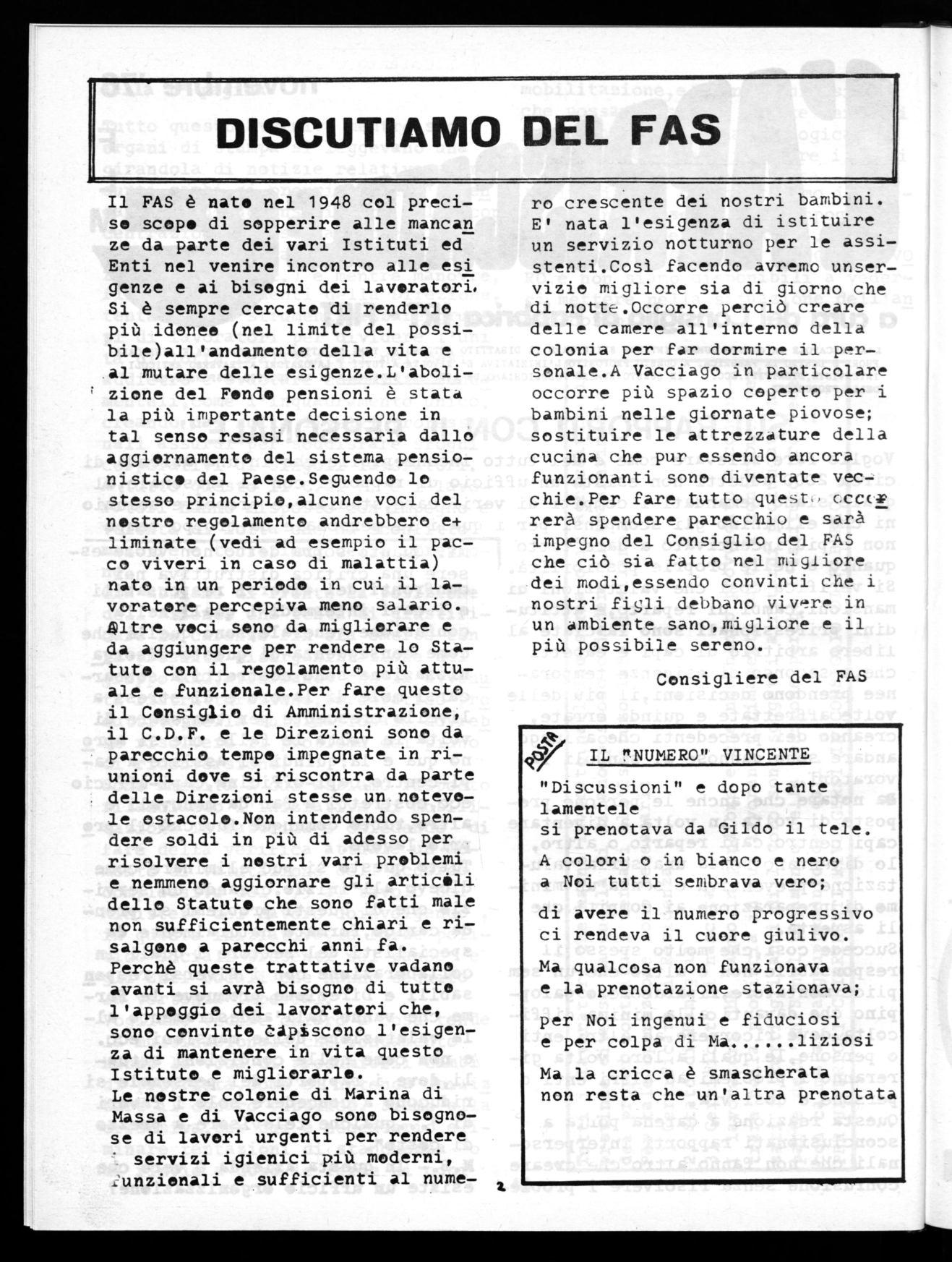 ro crescente dei nostri bambini. E' nata l'esigenza di istituire un servizio notturno per le assistenti.Così facendo avremo unservizie migliore sia di giorno che di notte.Occorre perciò creare delle camere all'interno della colonia per far dormire il personale.A Vacciago in particolare occorre più spazio coperto per i bambini nelle giornate piovose; sostituire le attrezzature della cucina che pur essendo ancora funzionanti sono diventate vecchie.Per fare tutto quest- cece rerà spendere parecchio e sarà impegno del Consiglio del FAS che ciò sia fatto nel migliore dei modi,essendo convinti che i nostri figli debbano vivere in un ambiente sano,migliore e il più possibile sereno.