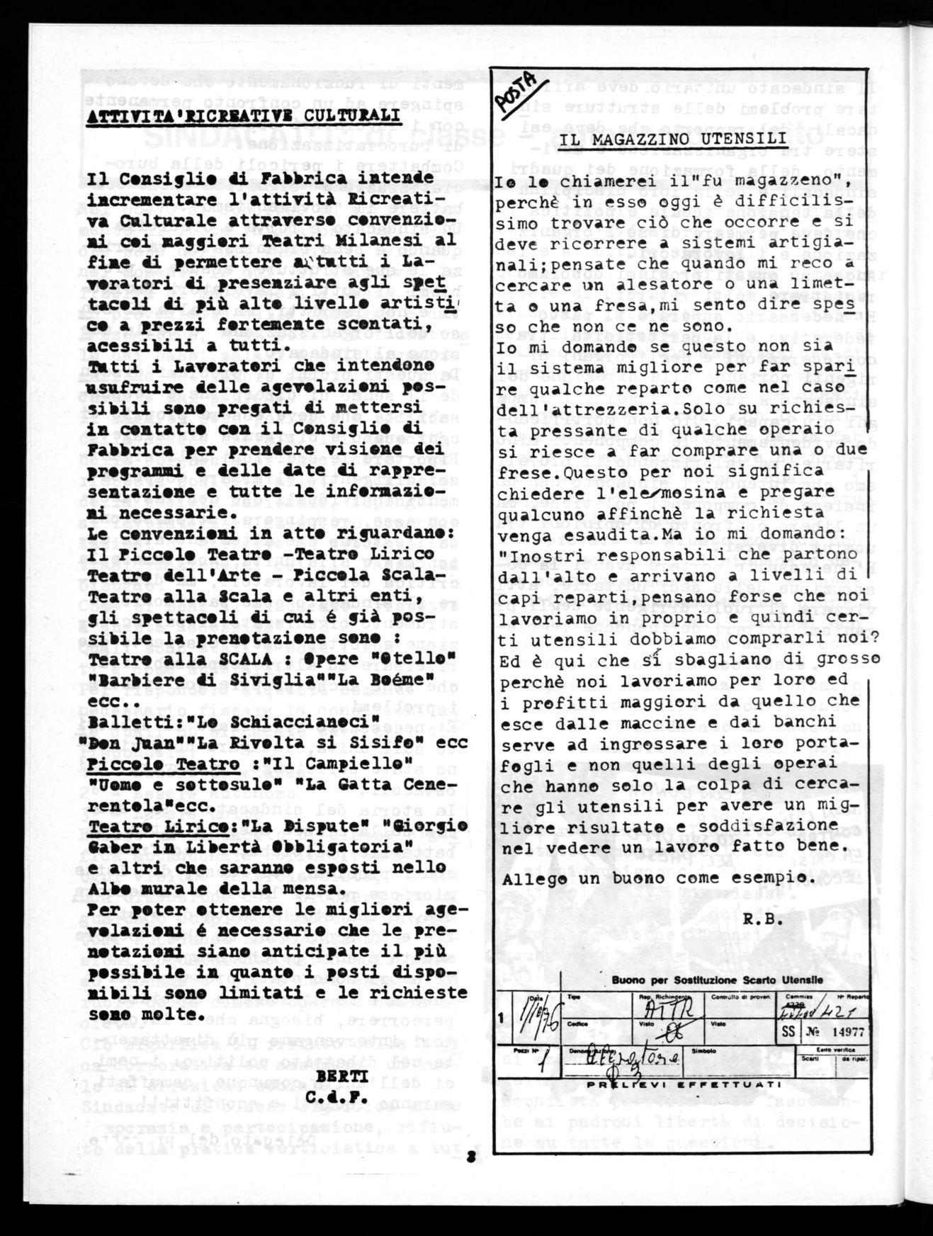 Il Consiglio di Fabbrica intende incrementare l'attività Ricreativa Culturale attraverso convenzioni coi maggiori Teatri Milanesi al fine di permettere al;tatti i Lavoratori di presenziare agli spet tacoli di più alto livello artisti, ce a prezzi fortemente scontati, acessibili a tutti.