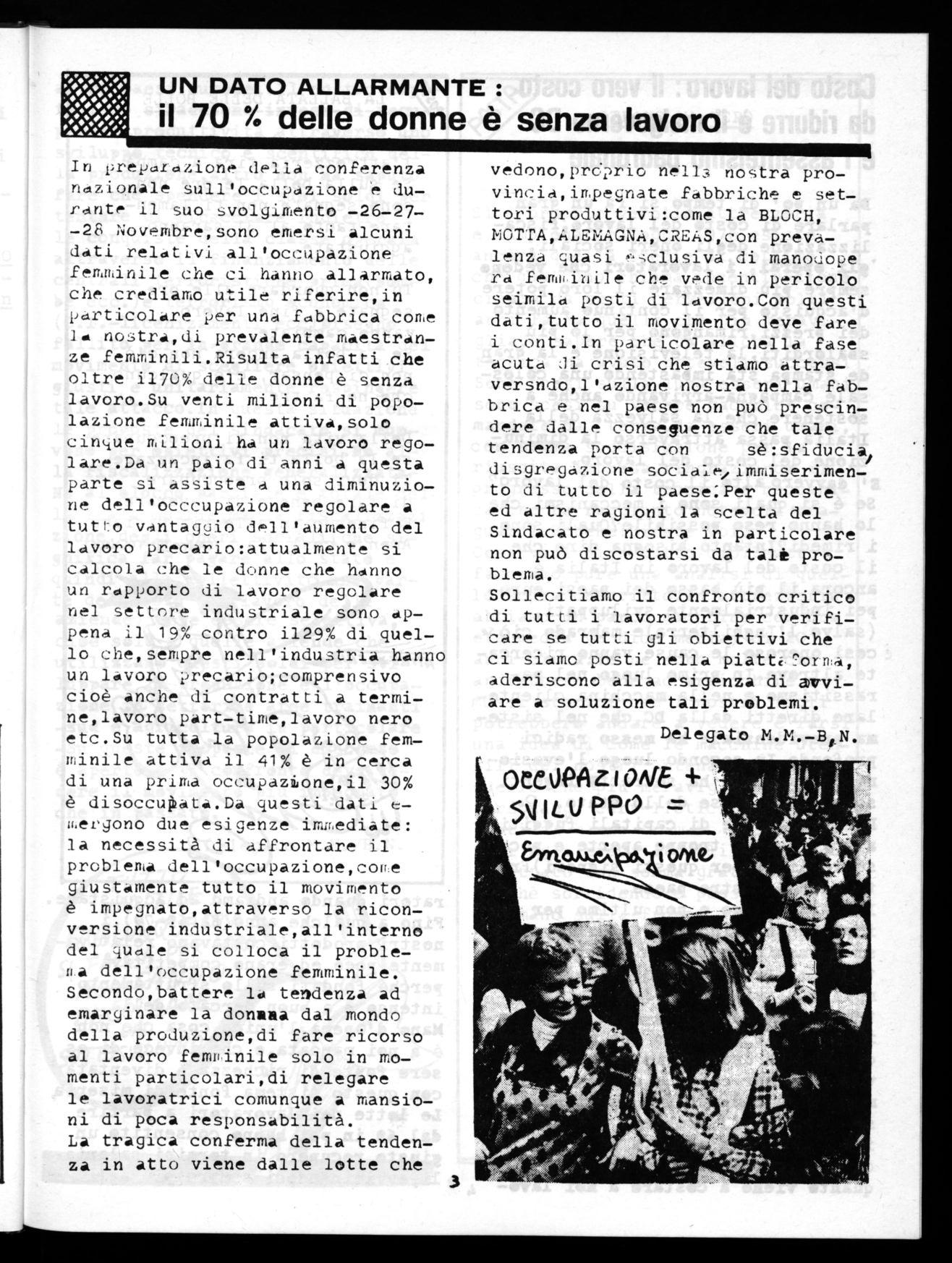 In preparazione della conferenza nazionale sull'occupazione e du— rante il suo svolgimento —26-27-28 Novembre, sono emersi alcuni dati relativi all'occupazione femminile che ci hanno allarmato, che crediamo utile riferire,in particolare per una fabbrica come la nostra,di prevalente maestran— ze femminili.Risulta infatti che oltre i170% delle donne è senza lavoro.Su venti milioni di popo— lazione femminile attiva, solo cinque milioni ha un lavoro rego— lare.Da un paio di anni a questa parte si assiste a una diminuzio— ne dell'occcupazione regolare a tuteo vantaggio dell'aumento del lavoro precario:attualmente si calcola che le donne che hanno un rapporto di lavoro regolare nel settore industriale sono ap— pena il 19% contro i129% di quel— lo che,sempre nell'industria hanno un lavoro j'recario;comprensivo cioè anche di contratti a termi— ne,lavoro part—time,lavoro nero etc.Su tutta la popolazione fem— minile attiva il 41% è in cerca di una prima occupazione,i1 30% è disoccuàata.Da questi dati e4c,evgono due esigenze immediate: la necessità di affrontare il problema dell'occupazione,come giustamente tutto il movimento è impegnato,attraverso la ricon— versione industriale,all'interno del quale si colloca il proble— ma dell'occupazione femminile.