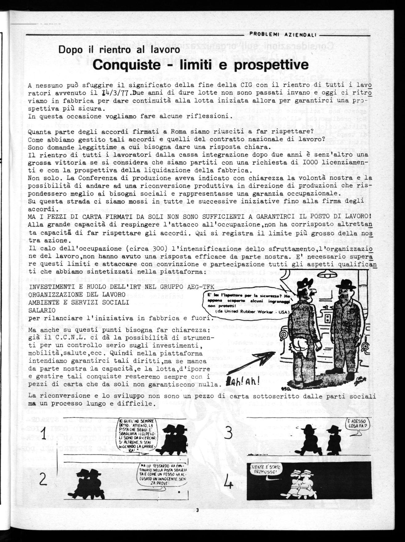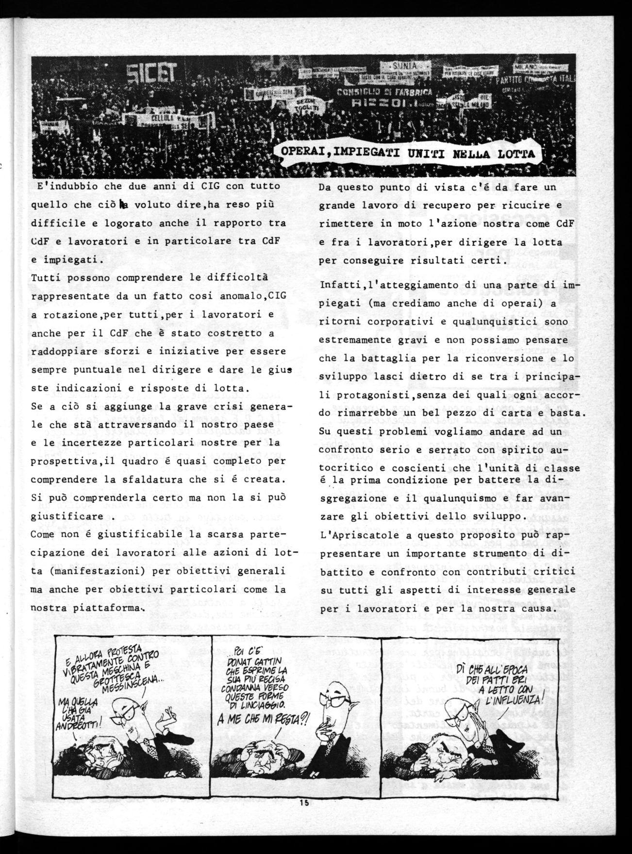 Infatti,l'atteggiamento di una parte di impiegati (ma crediamo anche di operai) a ritorni corporativi e qualunquistici sono estremamente gravi e non possiamo pensare che la battaglia per la riconversione e lo sviluppo lasci dietro di se tra i principali protagonisti,senza dei quali ogni accordo rimarrebbe un bel pezzo di carta e basta. Su questi problemi vogliamo andare ad un confronto serio e serrato con spirito autocritico e coscienti che l'unità di classe é la prima condizione per battere la disgregazione e il qualunquismo e far avanzare gli obiettivi dello sviluppo.
