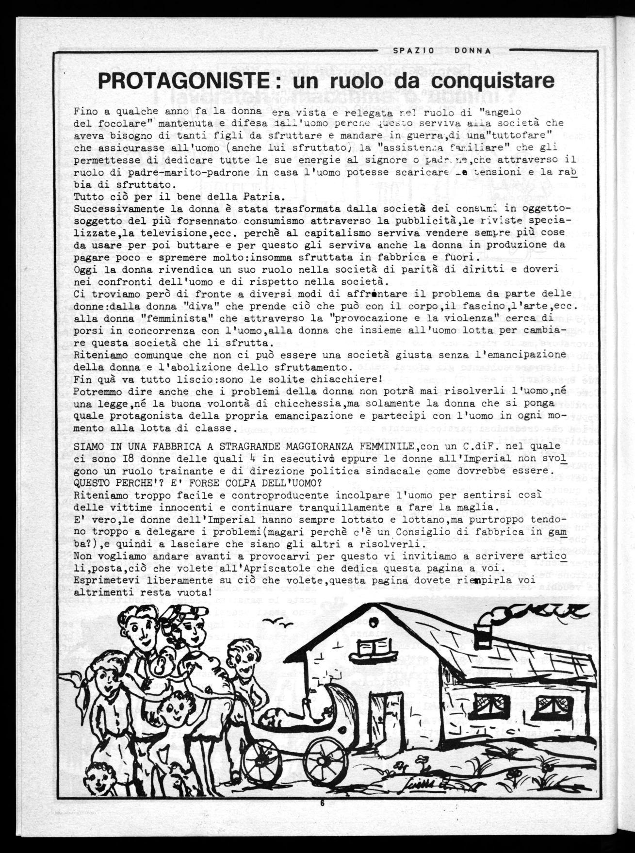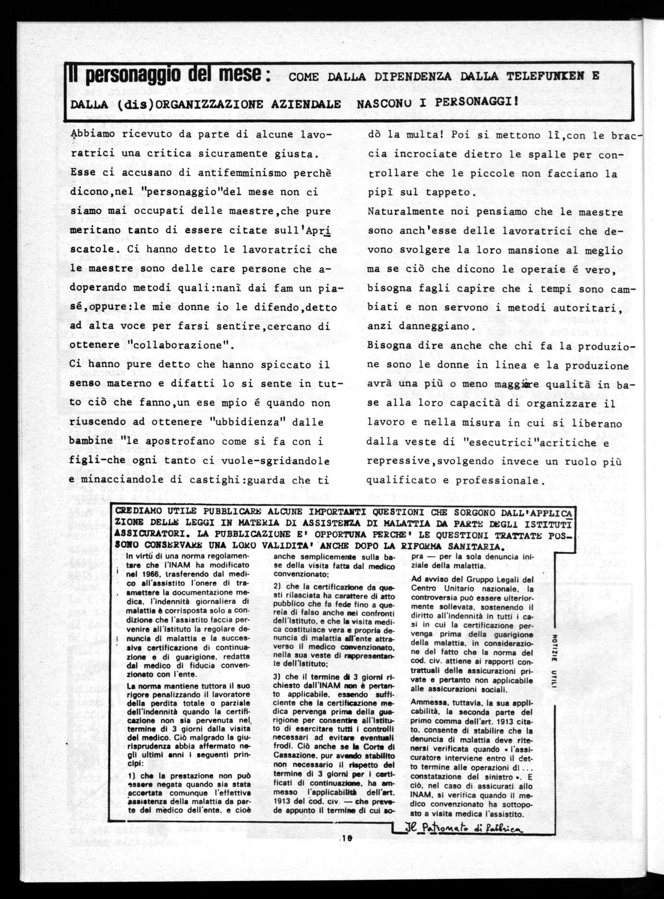 Abbiamo ricevuto da parte di alcune lavoratríci una critica sicuramente giusta. Esse ci accusano di antifemminismo perchè dícono,nel "personaggio"del mese non ci siamo mai occupati delle maestre,che pure meritano tanto di essere citate sull'Apri scatole. Cí hanno detto le lavoratrici che le maestre sono delle care persone che adoperando metodi quali:nanì dai fam un piasé,oppure:le mie donne io le difendo,detto ad alta voce per farsi sentire,cercano di ottenere "collaborazione".