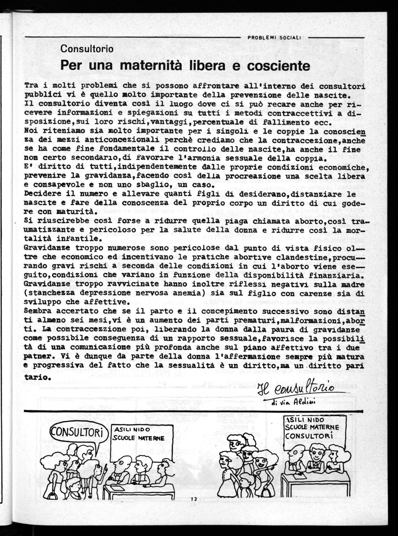 Tra i molti problemi che si possono affrontare all'interno dei consultori pubblici vi è quello molto importante della prevenzione delle nascite. Il consultorio diventa così il luogo dove ci si può recare anche per ricevere informazioni e spiegazioni su tutti i metodi contraccettivi a disposizione,sui loro rischi,vantaggi,percentuale di fallimento ecc. Noi riteniamo sia molto importante per i singoli e le coppie la conoscien za dei mezzi anticoncezionali perchè crediamo che la contraccezione,anche se ha come fine fondamentale il controllo delle nascite,ha anche il fine non certo secondario,di favorire l'armonia sessuale della coppia.
