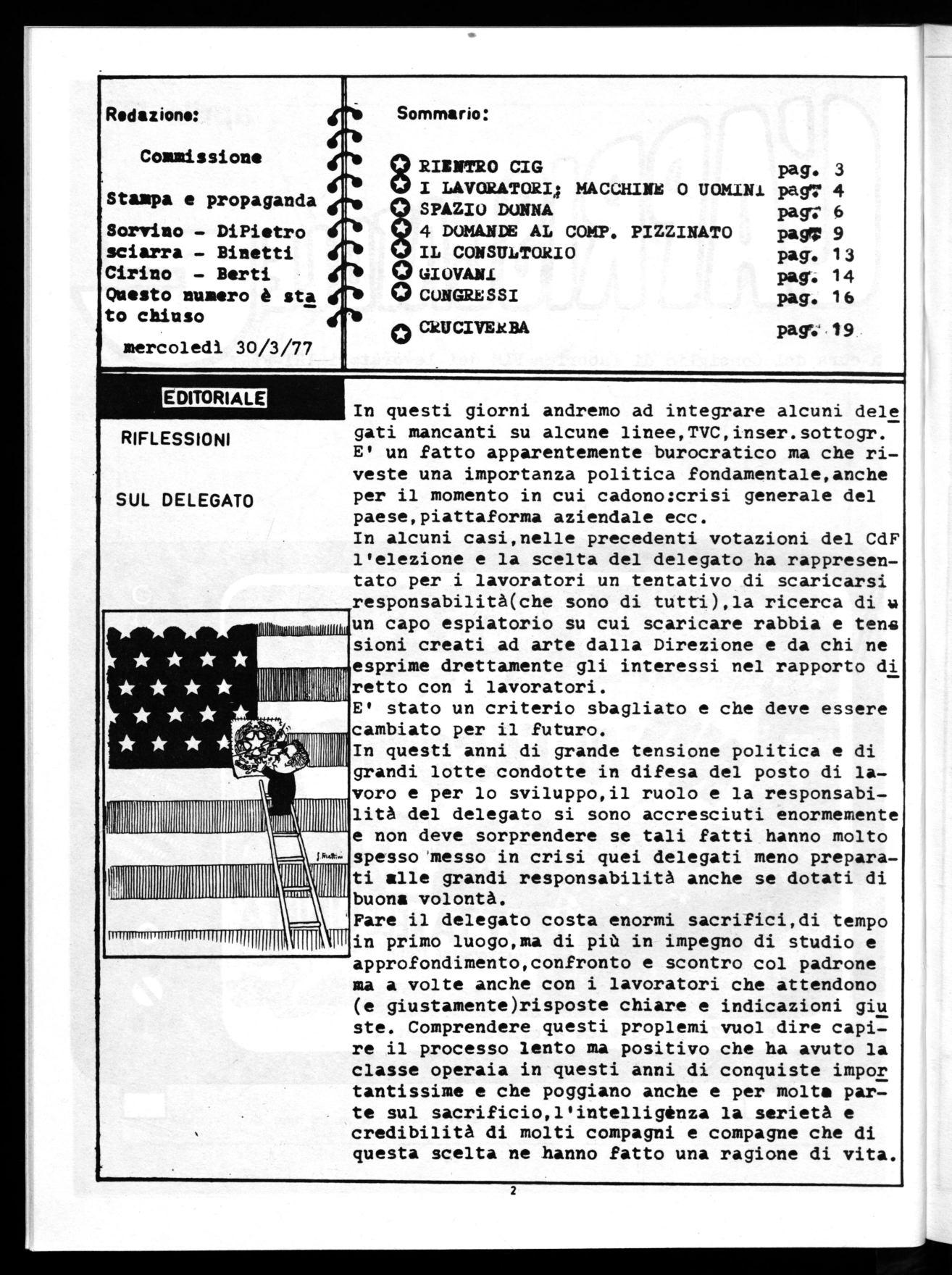 In questi anni di grande tensione politica e di grandi lotte condotte in difesa del posto di lavoro e per lo sviluppo,il ruolo e la responsabilità del delegato si sono accresciuti enormemente e non deve sorprendere se tali fatti hanno molto spesso 'messo in crisi quei delegati meno preparati alle grandi responsabilità anche se dotati di buona volontà.