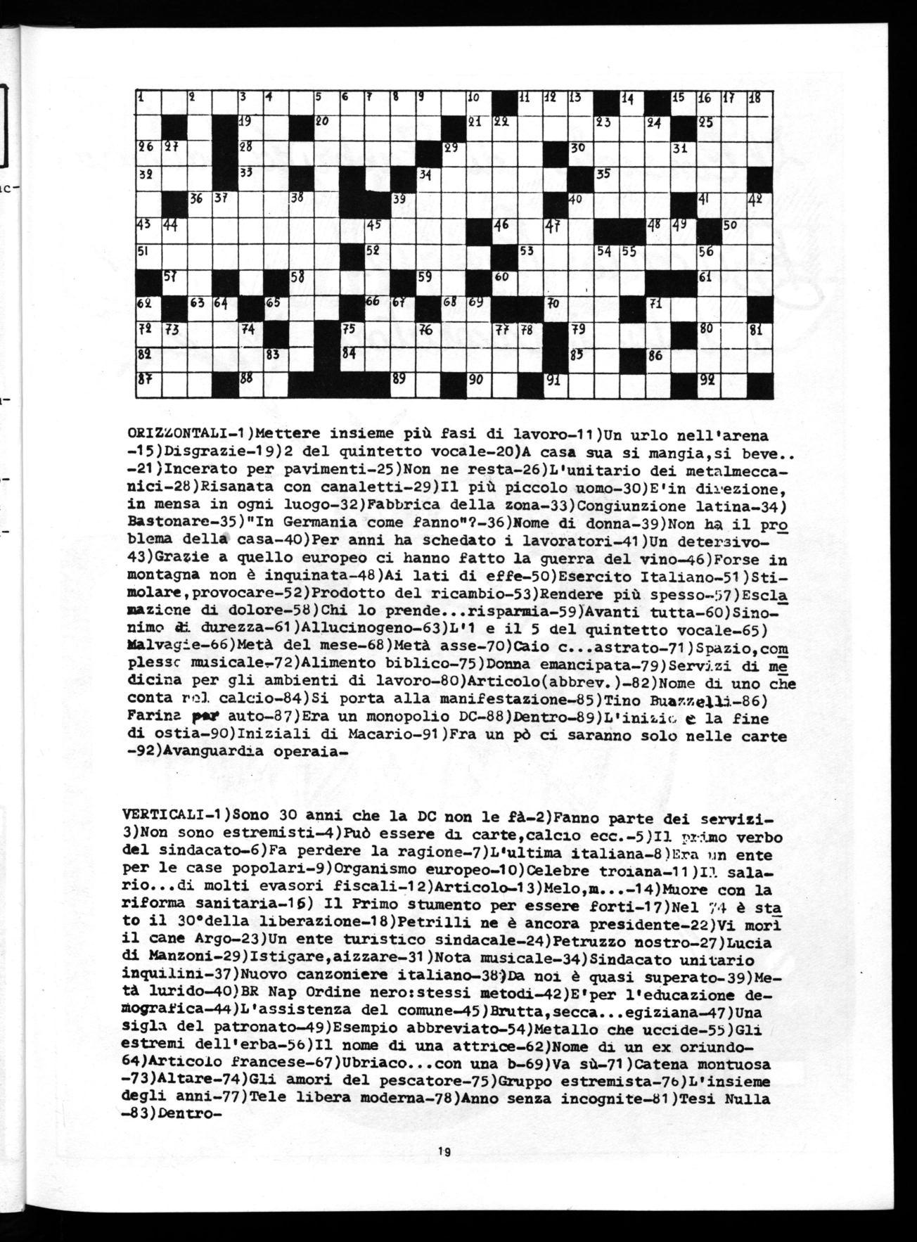 ORIZZONTALI-1)Mettere insieme più fasi di lavoro-11)Un urlo nell'arena -15)Disgrazie-19)2 del quintetto vocale-20)A casa sua si mangia,si beve.. -21)Incerato per pavimenti-25)Non ne resta-26)L'unitario dei metalmeccanici-28)Risanata con canaletti-29)Il più piccolo uomo-30)E'in direzione, in mensa in ogni luogo-32)Fabbrica della zona-33)Congiunzione latina-34) Bastonare-35)"In Germania come fanno"?-36)Nome di donna-39)Non ha il pro blema della casa-40)Per anni ha schedato i lavoratori-41)Un detersivo43)Grazie a quello europeo ci hanno fatto la guerra del vino-46)Forse in montagna non è inquinata-48)Ai lati di effe-50)Esercito Italiano-51)Stimolare,provocare-52)Prodotto del ricambio-53)Rendere più spesso-57)Escla mazicne di dolore-58)Chi lo prende...risparmia-59)Avanti tutta-60)Sinonimr di durezza-61)Allucinogeno-63W1 e il 5 del quintetto vocale-65) Malvaqie-66)Metà del mese-68)Metà asse-70)Caio c...astrato-71)Spazio,com plessc musicale72)Alimento biblico-75)Donna emancipata-79)Serv5.zi di me dicina per gli ambienti di lavoro-80)Articolo(abbrev.)-82)Nome di uno che conta re.,1 calcio-84)Si porta alla manifestazione-85)Tino Buazzel1.-86) Farina p.' auto-87)Era un monopolio DC-88)Dentro-89)L'iniziG e la fine di ostia-90)Iniziali di Macario-91)Fra un O. ci saranno solo nelle carte -92)Avanguardia operaia-