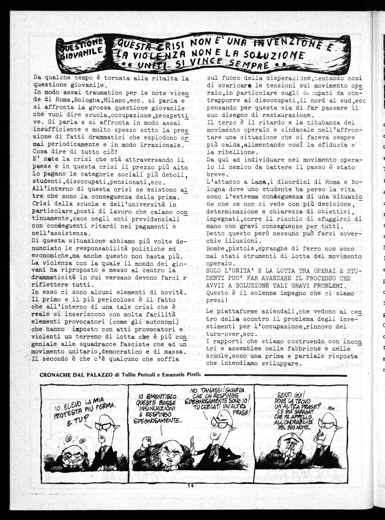 In modo assai traumatico per le note vicen de di Roma,Bologna,Milano,ecc. si parla e si affronta la grossa questione giovanile che vuol dire scuola,occupazione,prospetti ve. Si parla e si affronta in modo assai insufficiente e molto spesso sotto la pres sione di fatti drammatici che esplodono or mai periodicamente e in modo irrazionale. Cosa dire di tutto ciò?