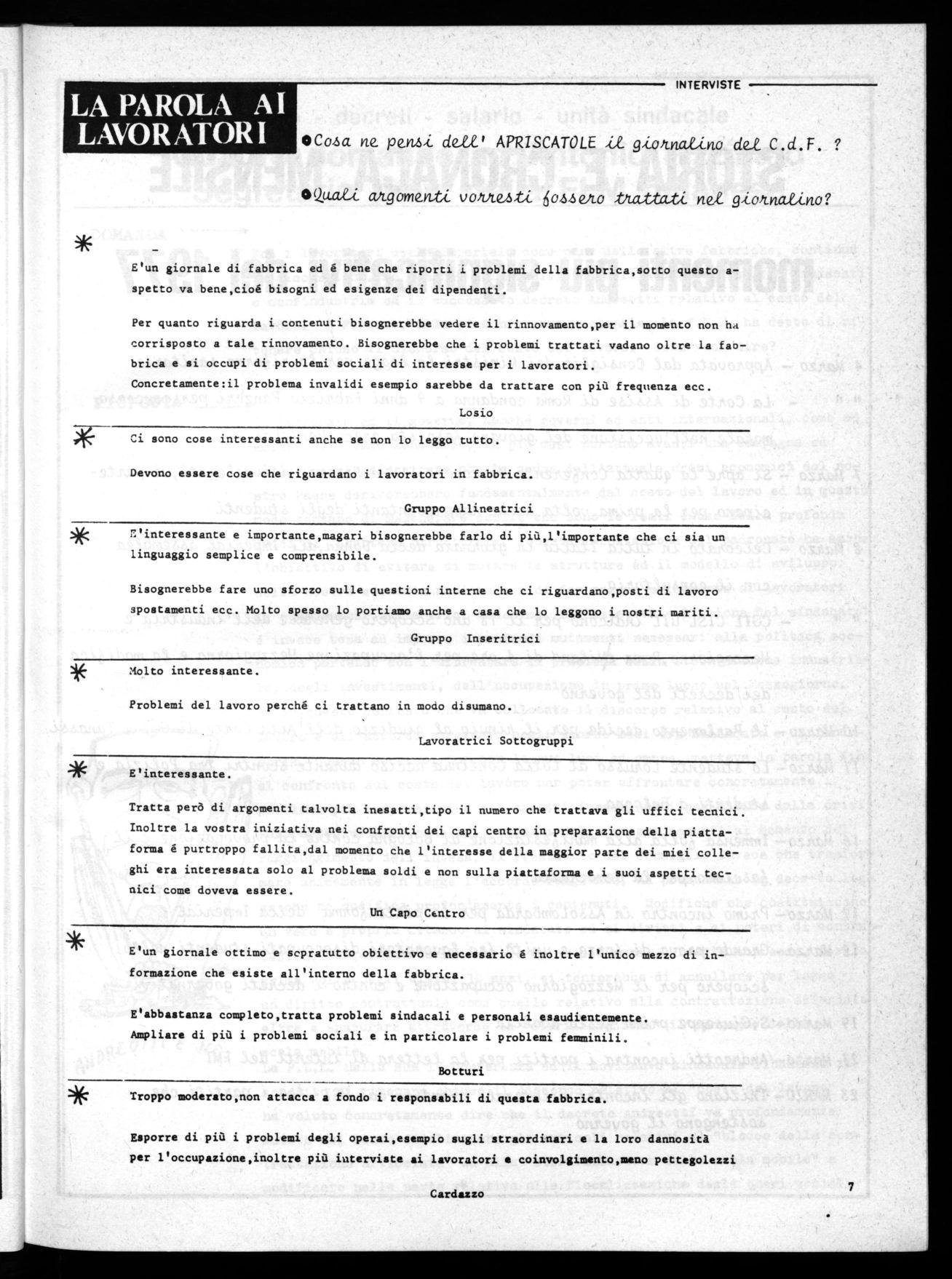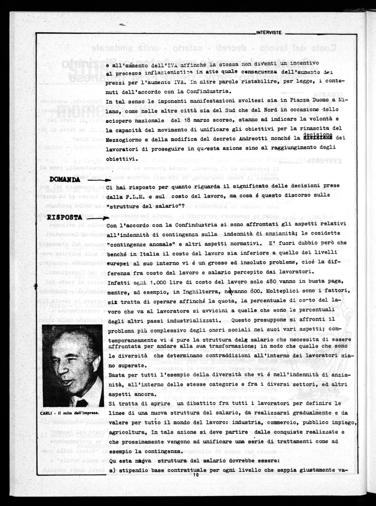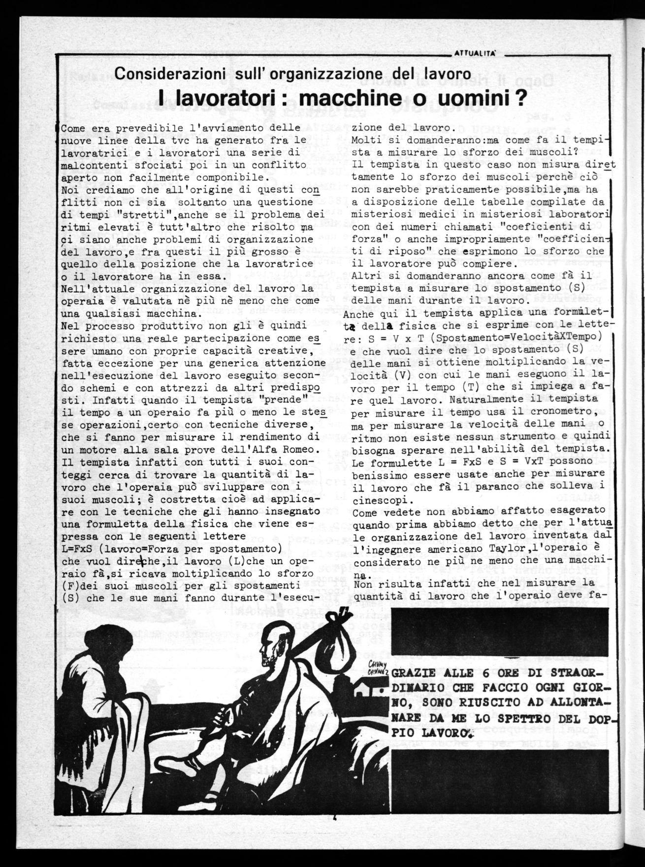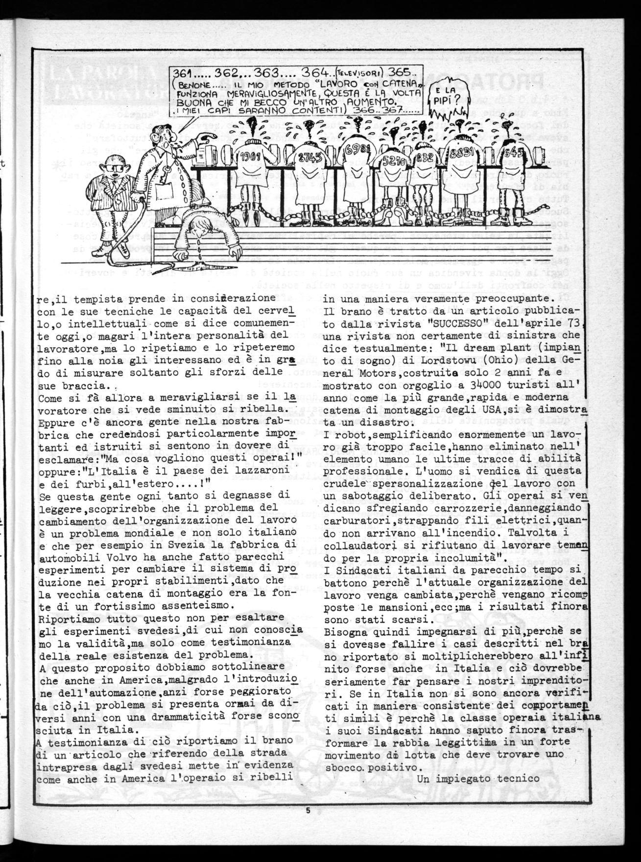 Come si fà allora a meravigliarsi se il la voratore che si vede sminuito si ribella. Eppure c'é ancora gente nella nostra fabbrica che credendosi particolarmente impor tanti ed istruiti si sentono in dovere di esclamate:"Ma cosa vogliono questi operai!" oppure:"L'Italia é il paese dei lazzaroni e dei furbi,all'estero ' t1