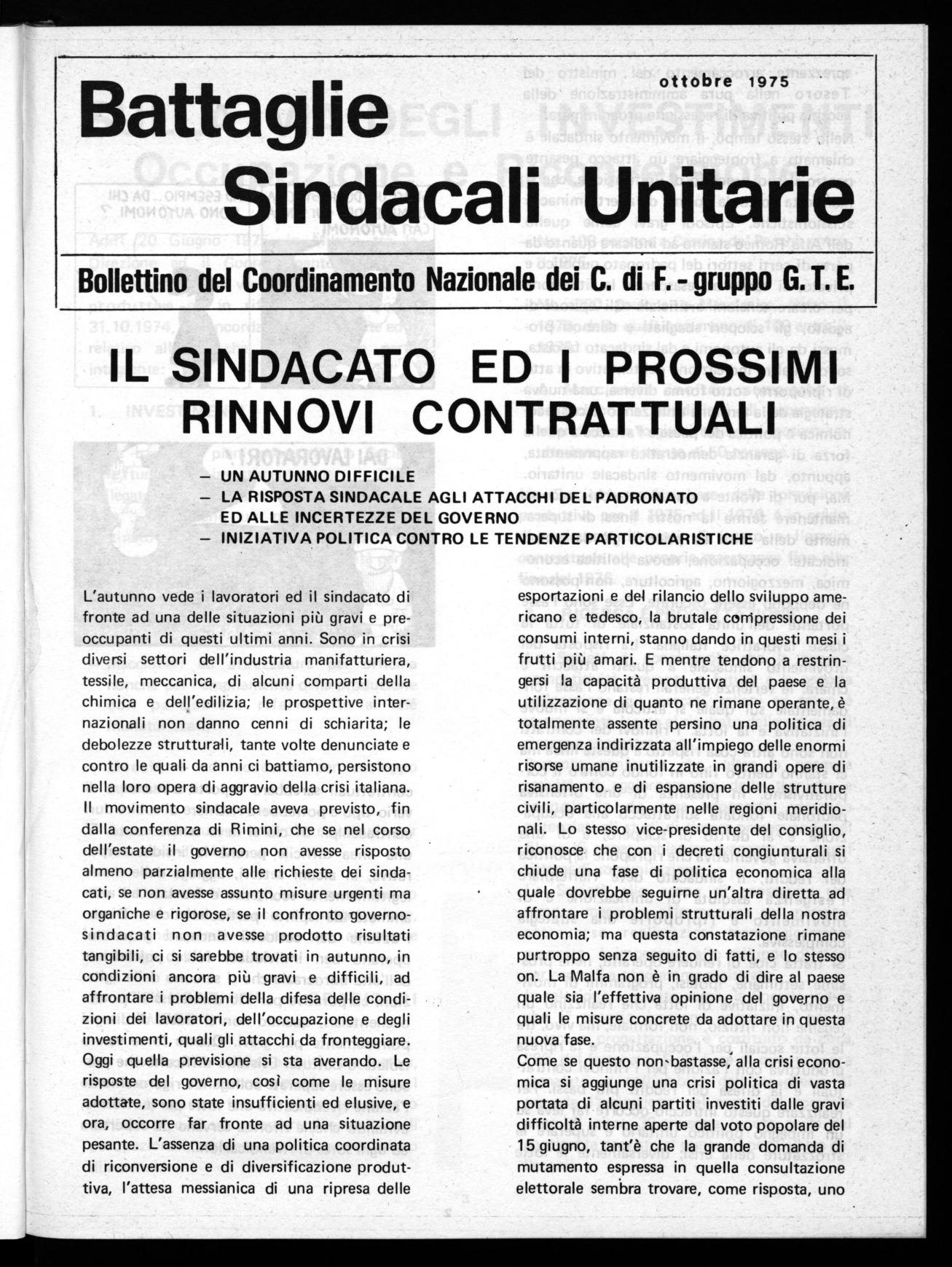Si tratta cioè di rendere operanti, nelle prossime settimane, ipotesi, programmi di movimento, iniziative di lotta che realizzino un legame non fittizio, non formale, ma vivo, tra le lotte sociali per l'occupazione e la ripresa produttiva con l'azione per i rinnovi contrattuali e la difesa dei redditi più bassi. Per realizzare questo intreccio occorre far leva su un impegno politico unitario e superare le strozzature della crisi; diversamente le -lotte