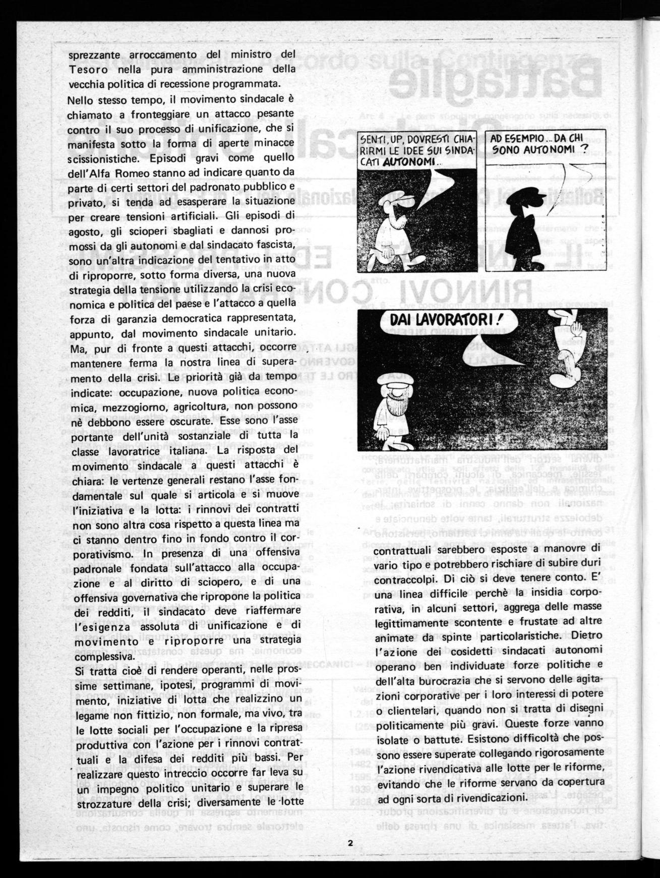 sprezzante arroccamento del ministro del Tesoro nella pura amministrazione della vecchia politica di recessione programmata. Nello stesso tempo, il movimento sindacale è chiamato a fronteggiare un attacco pesante contro il suo processo di unificazione, che si manifesta sotto la forma di aperte minacce scissionistiche. Episodi gravi come quello dell'Alfa Romeo stanno ad indicare quanto da parte di certi settori del padronato pubblico e privato, si tenda ad esasperare la situazione per creare tensioni artificiali. Gli episodi di agosto, gli scioperi sbagliati e dannosi promossi da gli autonomi e dal sindacato fascista, sono un'altra indicazione del tentativo in atto di riproporre, sotto forma diversa, una nuova strategia della tensione utilizzando la crisi economica e politica del paese e l'attacco a quella forza di garanzia democratica rappresentata, appunto, dal movimento sindacale unitario. Ma, pur di fronte a questi attacchi, occorre mantenere ferma la nostra linea di superamento della crisi. Le priorità già da tempo indicate: occupazione, nuova politica economica, mezzogiorno, agricoltura, non possono nè debbono essere oscurate. Esse sono l'asse portante dell'unità sostanziale di tutta la classe lavoratrice italiana. La risposta del movimento sindacale a questi attacchi è chiara: le vertenze generali restano l'asse fondamentale sul quale si articola e si muove l'iniziativa e la lotta: i rinnovi dei contratti non sono altra cosa rispetto a questa linea ma ci stanno dentro fino in fondo contro il corporativismo. In presenza di una offensiva padronale fondata sull'attacco alla occupazione e al diritto di sciopero, e di una offensiva governativa che ripropone la politica dei redditi, il sindacato deve riaffermare l'esigenza assoluta di unificazione e di movimento e riproporre una strategia complessiva.