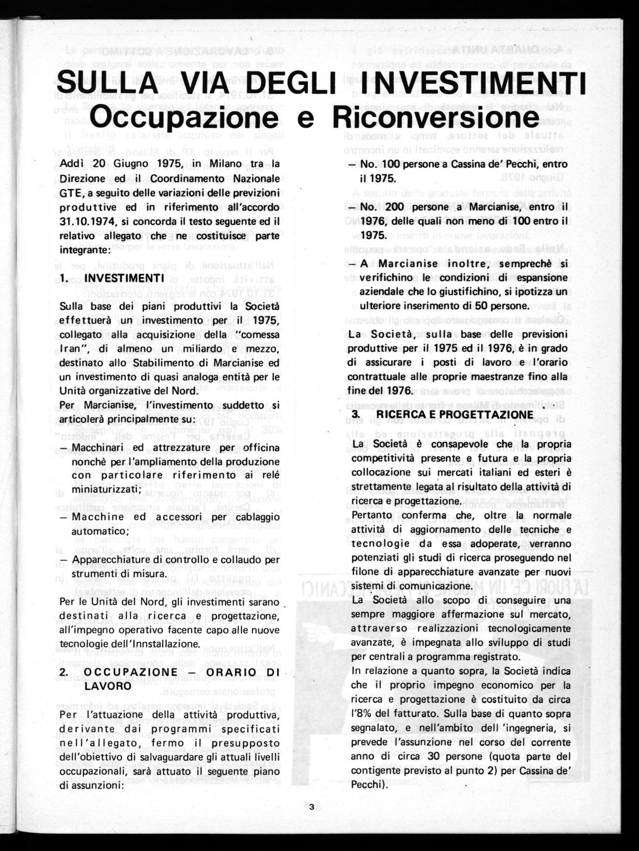 Addì 20 Giugno 1975, in Milano tra la Direzione ed il Coordinamento Nazionale GTE, a seguito delle variazioni delle previzioni produttive ed in riferimento all'accordo 31.10.1974, si concorda il testo seguente ed il relativo allegato che ne costituisce parte integrante: