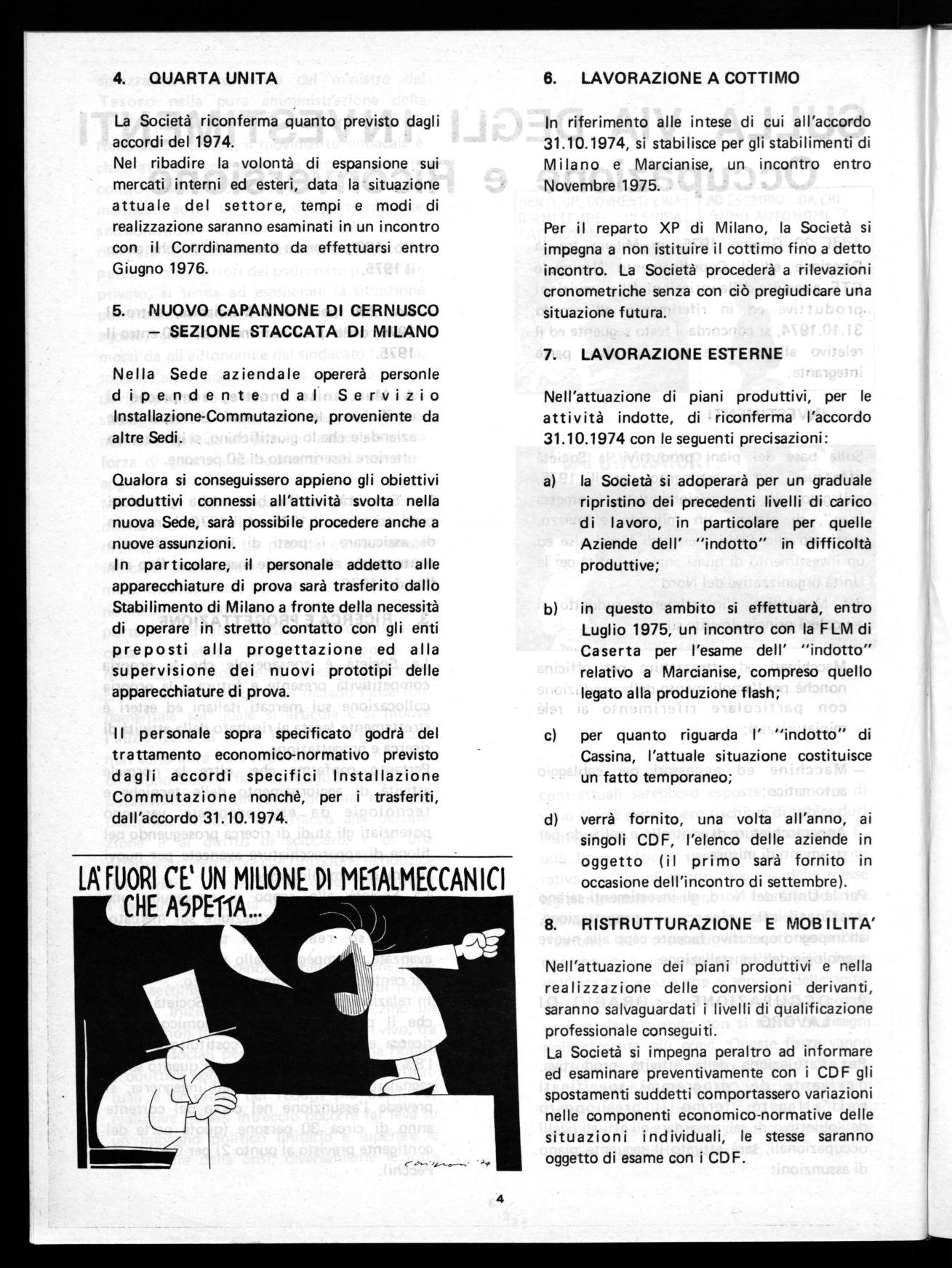 Le parti convengono che si effettuarà entro il mese di Settembre 1975, un primo incontro di verifica del presente accordo tra la Direzione ed il Coordinamento con particolare riferimento a: investimenti complessivi e prospettive produttive per l'Unità di Milano.