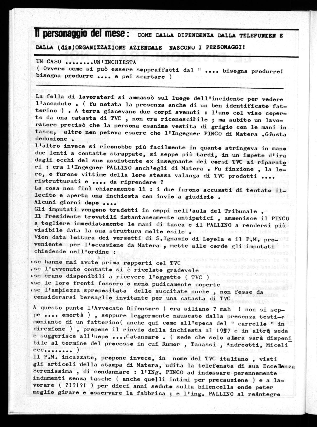 Il P.M. incazzato, propone invece, in nome del TVC italiano , visti gli articoli della stampa di Matera2 udita la telefonata di sua Eccellenza Serenissima di condannare : l'INg. PINCO ad indossare perennemente indumenti senza tasche ( anche quelli intimi per precauzione ) e a lavorare ( ) per dieci anni seduto sulla bilencella onde poter meglio girare e osservare la fabbrica ; e l'ing. PALLINO al reintegro