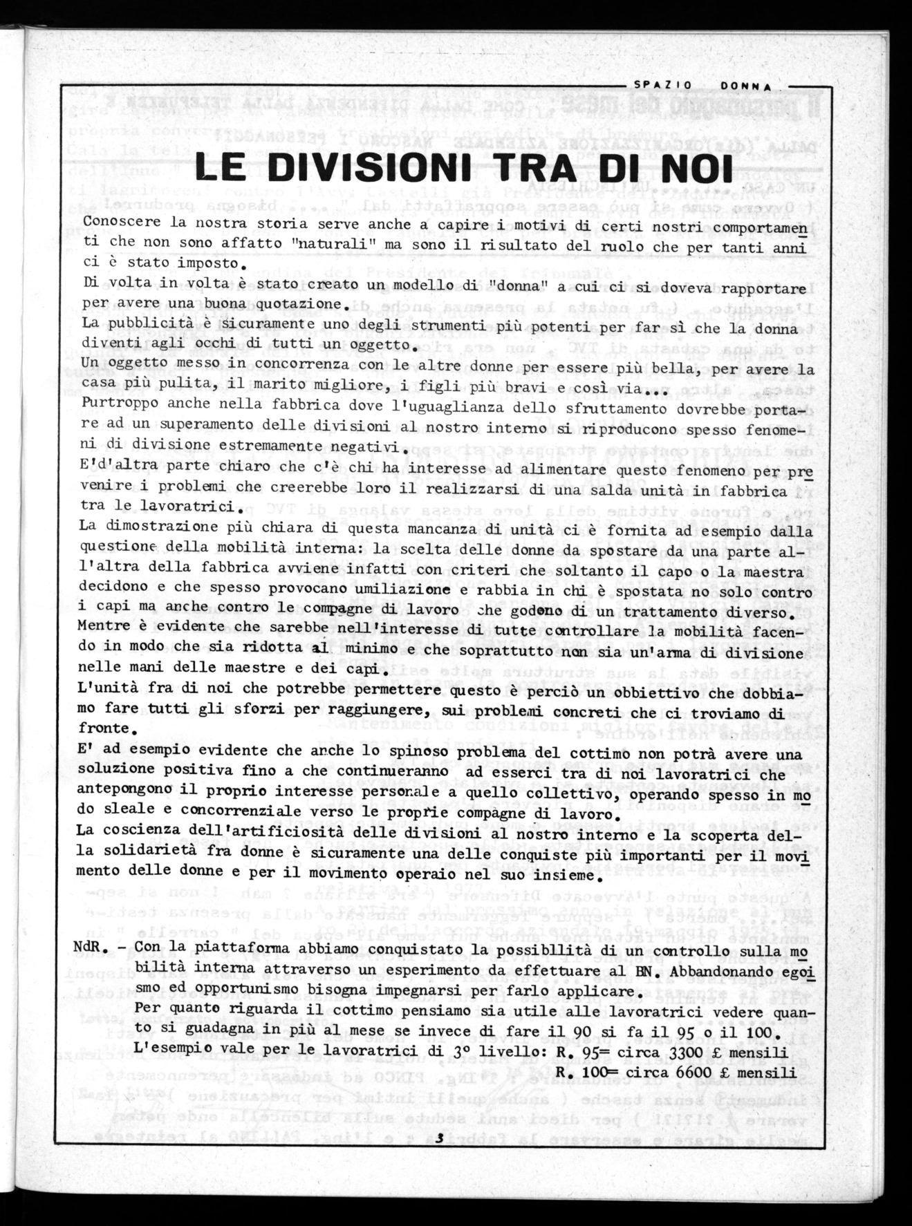 La dimostrazione più chiara di questa mancanza di unità ci è fornita ad esempio dalla questione della mobilità interna: la scelta delle donne da spostare da una parte all'altra della fabbrica avviene infatti con criteri che soltanto il capo o la maestra decidono e che spesso provocano umiliazione e rabbia in chi è spostata no solo contro i capi ma anche contro le compagne di lavoro che godono di un trattamento diverso. Mentre è evidente che sarebbe nell'interesse di tutte controllare la mobilità facendo in modo che sia ridotta al minimo e che soprattutto non sia un'arma di divisione nelle mani delle maestre e dei capi.