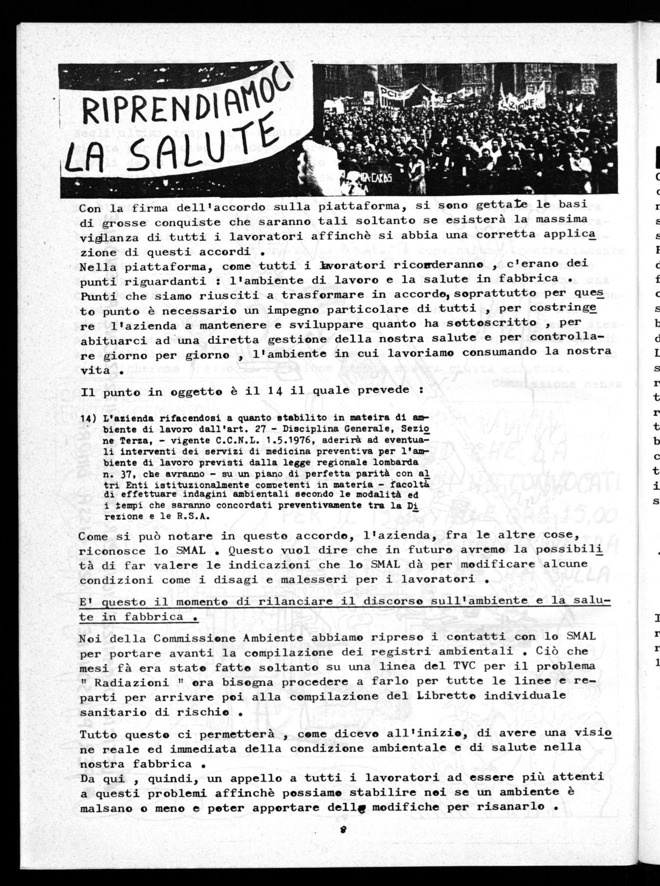 Con la firma dell'accordo sulla piattaforma, si sono gettate le basi di grosse conquiste che saranno tali soltanto se esisterà la massima vidlanza di tutti i lavoratori affinchè si abbia una corretta applica zione di questi accordi . Nella piattaforma, come tutti i lavoratori ricorderanno , c'erano dei punti riguardanti : l'ambiente di lavoro e la salute in fabbrica Punti che siamo riusciti a trasformare in accordol soprattutto per ques to punto è necessario un impegno particolare di tutti per costringe re l'azienda a mantenere e sviluppare quanto ha sottoscritto , per abituarci ad una diretta gestione della nostra salute e per controllare giorno per giorno l'ambiente in cui lavoriamo consumando la nostra vita .