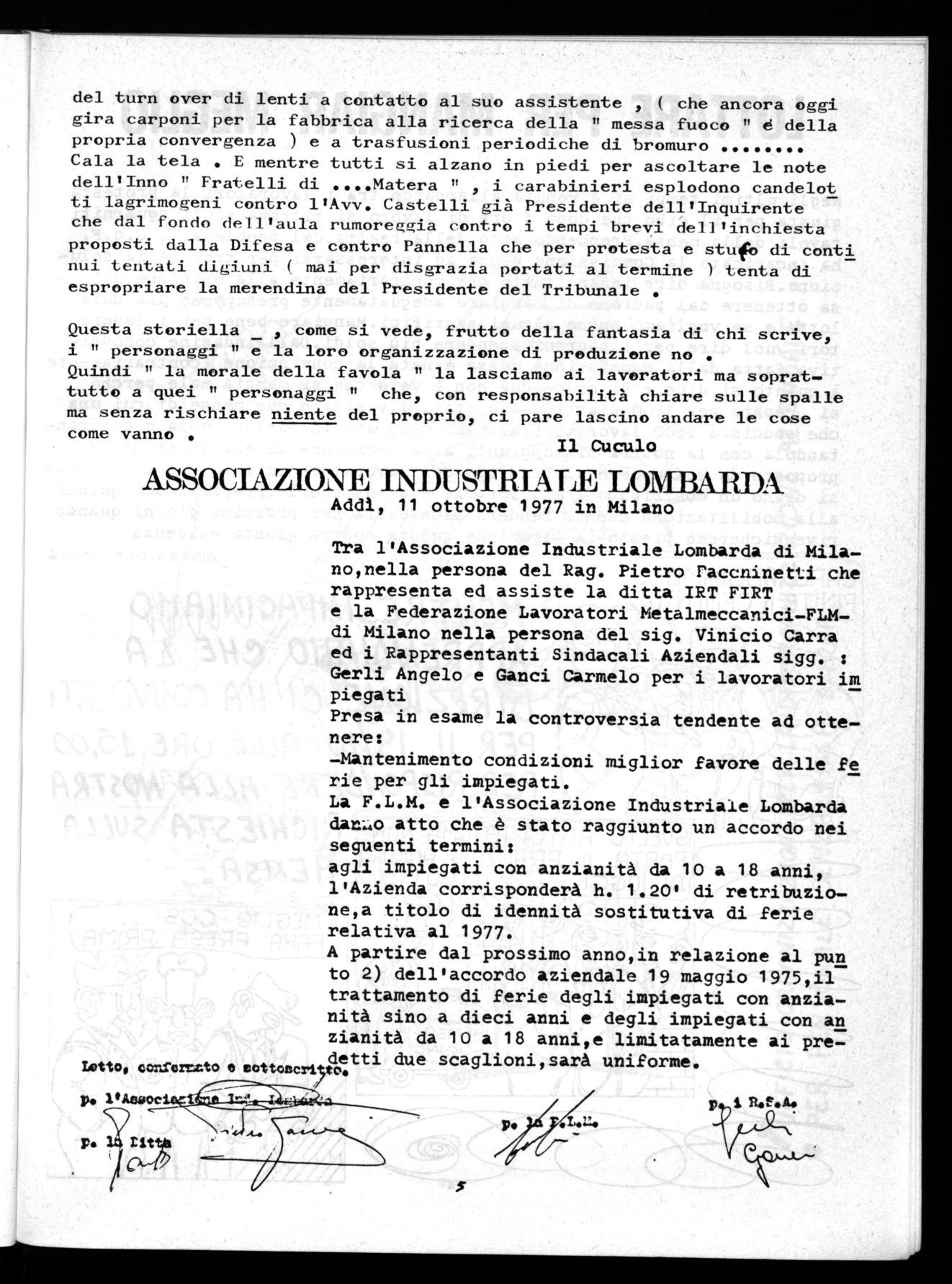 Tra l'Associazione Industriale Lombarda di Milano,nella persona del Rag. Pietro raccninetti che rappresenta ed assiste la ditta IRT FIRT e la Federazione Lavoratori Metalmeccanici-FLMdi Milano nella persona del sig. Vinicio Carra ed i Rappresentanti Sindacali Aziendali sigg. : Gerli Angelo e Ganci Carmelo per i lavoratori im piegati