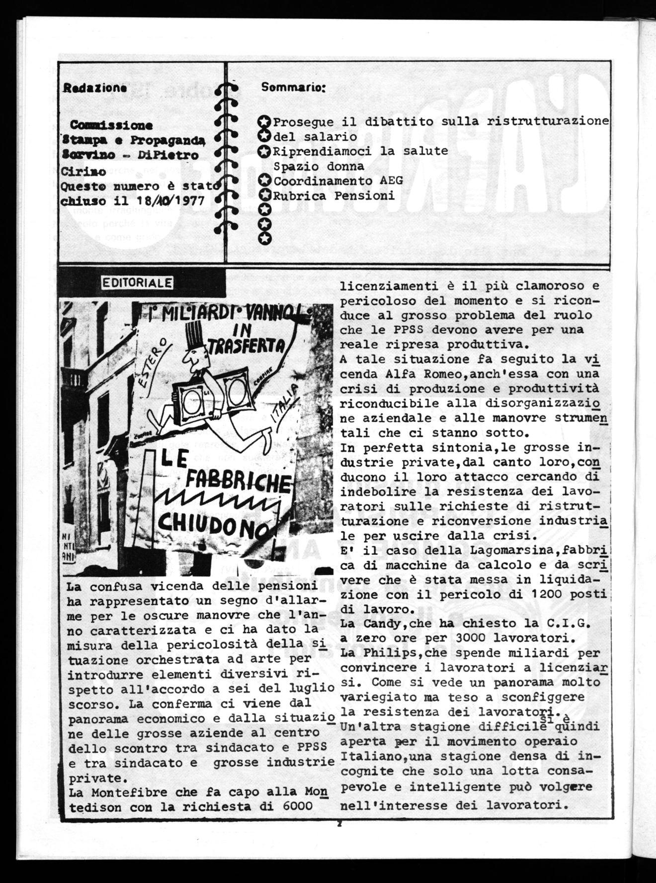 La confusa vicenda delle pensioni ha rappresentato un segno d'allarme per le oscure manovre che l'anno caratterizzata e ci ha dato la misura della pericolosità della si tuazione orchestrata ad arte per introdurre elementi diversivi rispetto all'accordo a sei del luglio scorso. La conferma ci viene dal panorama economico e dalla situazist ne delle grosse aziende al centro dello scontro tra sindacato e PPSS e tra sindacato e grosse industrie private.