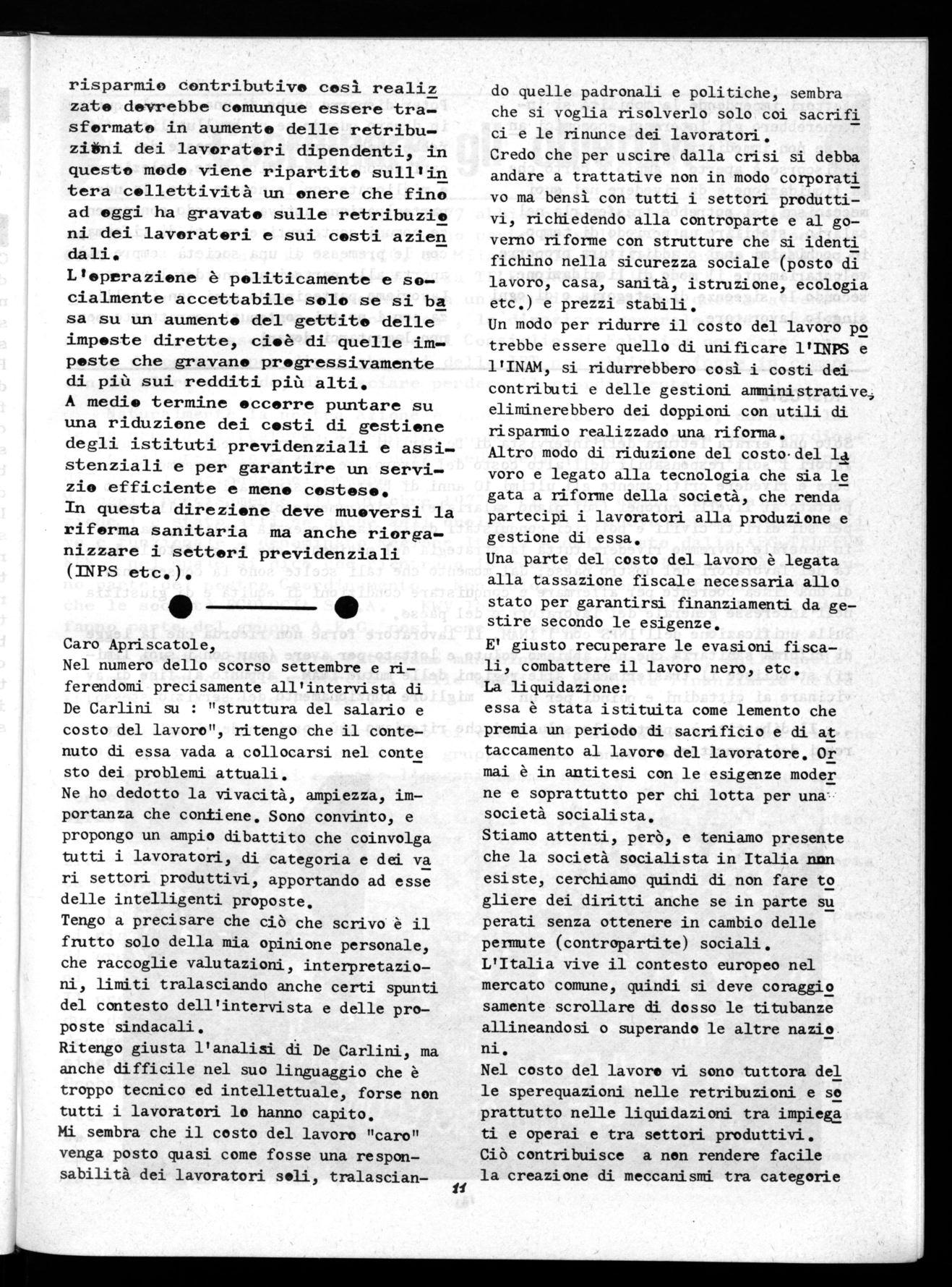 Solo una errata lettura dell'intervista di De Carlini può indurre a vedere nei lavoratori i soli responsabili dell'alto costo del lavoro, se così fosse dovremmo ridiscu tere e rivedere criticamente gli ultimi 10 anni di battaglie sindacali che ci hanno portato ai livelli europei (sul piano salariale) e sicuramente oltre i livelli europei sui diritti civili e politici conquistati dalla classe operaia italiana, ma più in generale dovremmo rivedere tutta la strategia del movimento che ha guidato la lotta dei lavoratori del nostro paese; dal momento che tali scelte- sono la conseguenza di una linea coerente per affermare e conquistare condizioni di equità e di giustizia nell'interesse generale dei lavoratori e del paese.